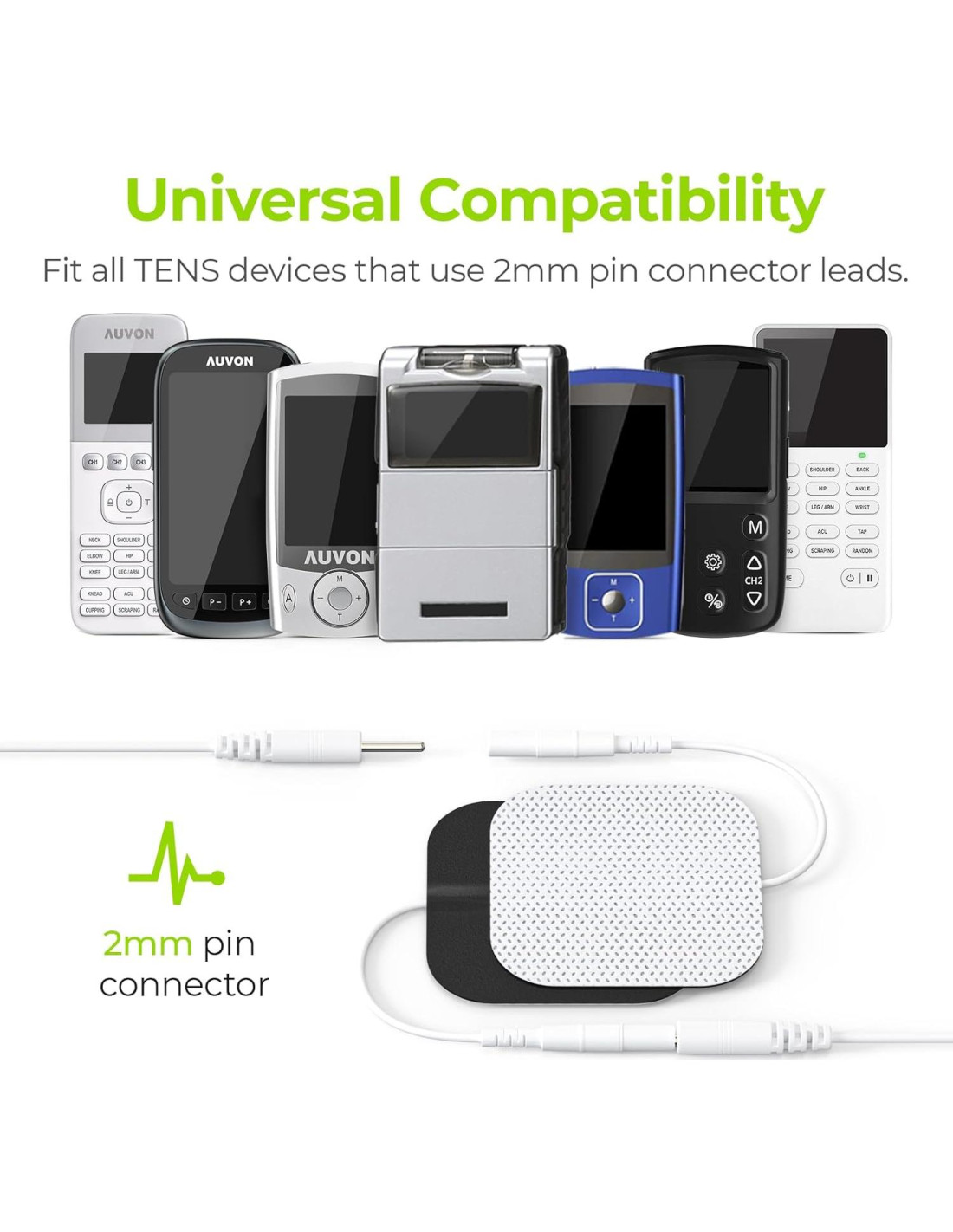 - Compatibilidad Universal. Las almohadillas de electrodos AUVON para la unidad TENS están diseñadas para todas las unidades TENS EMS y masajistas que utilizan conectores de pin de 2mm como TENS 7000, Eteckcity y Nicwell, así que no más preocupaciones de compatibilidad.