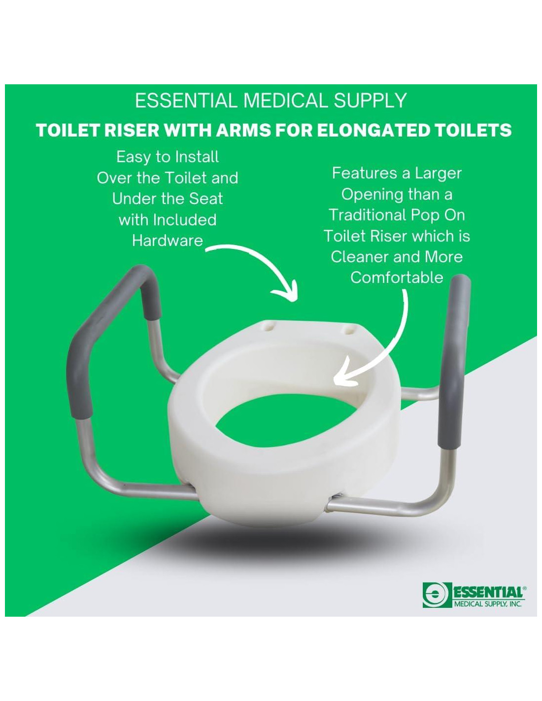 El asiento elevado para inodoro con brazos proporciona al usuario la elevación de un asiento de inodoro estándar pero aún les permite usar su propio asiento. Los brazos acolchados y removibles lo hacen más seguro al subir o bajar del inodoro. Disponible en tamaños estándar y alargados e incluye todo el hardware. Límite de peso del usuario - 136 kilogramos Fácil de instalar a través de pernos largos y tuercas de mariposa
