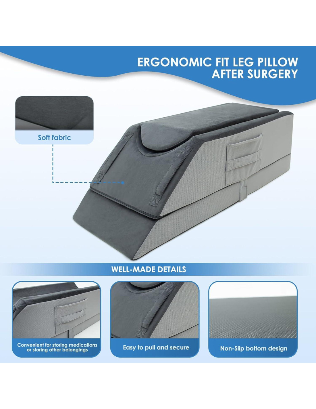 - DISEÑO CON ASAS Y BOLSILLOS El cojín de equipo de recuperación de cirugía de rodilla presenta una inclinación de 40 grados para brindarte la máxima comodidad. El cojín para las piernas tiene un total de cuatro asas, dos en la parte frontal para facilitar su agarre y posicionamiento con la mano izquierda o derecha, y dos en los laterales para transportarlo. El cojín elevador de piernas también cuenta con un diseño de bolsillo en ambos lados, con bolsillos en los lados izquierdo y derecho diseñados para facilitar el almacenamiento de tu medicación después de aplicarla o para guardar tu teléfono celular y otros artículos de mano