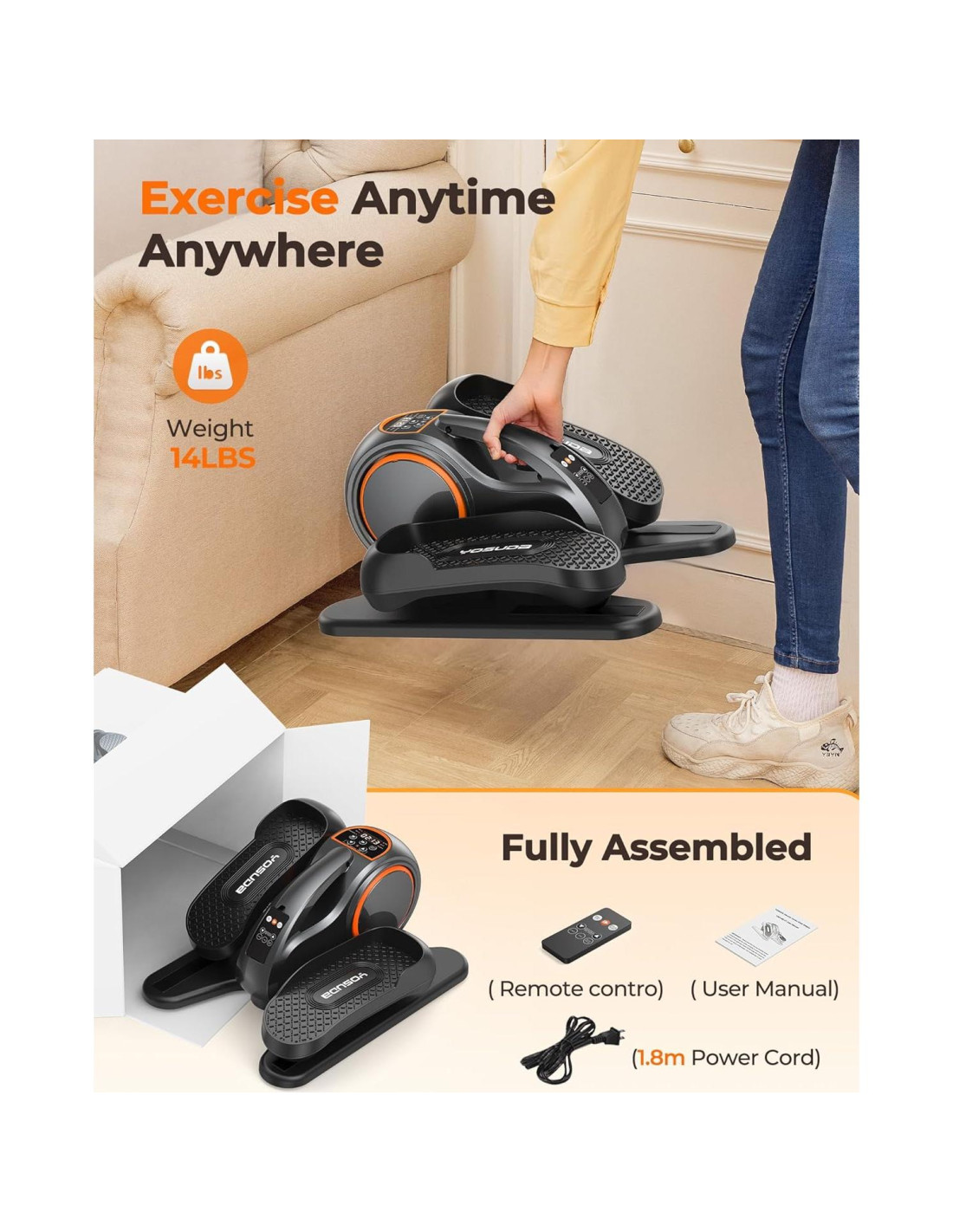 - Lo que obtendrás: YOSUDA elíptica bajo escritorio Pro con control remoto, modos versátiles para ejercicio de piernas. YOSUDA tiene más de 20 años de experiencia en ejercicio en casa; confiable por más de 1 millón de familias, ofreciendo soporte al cliente 24/7.