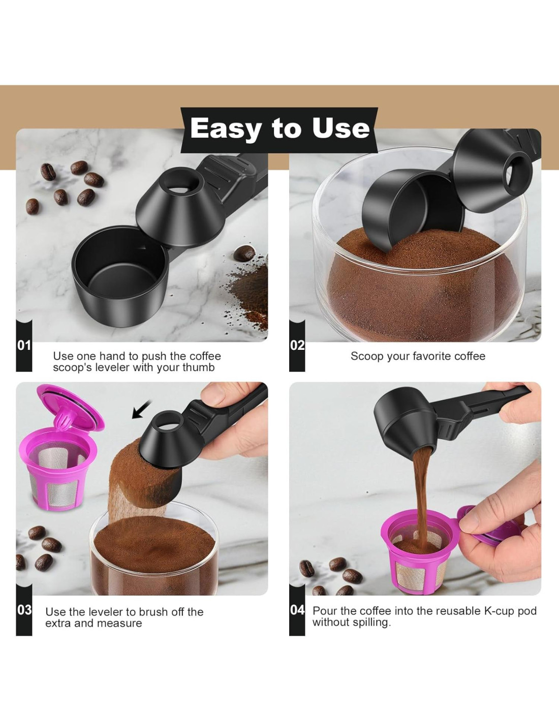 - Fácil de usar: Simplemente presiona el nivelador del cucharón con tu pulgar, saca el café y desliza el nivelador para eliminar cualquier exceso. Luego, voltea el cucharón embudo para verter el café molido ordenadamente en tus cápsulas K reutilizables