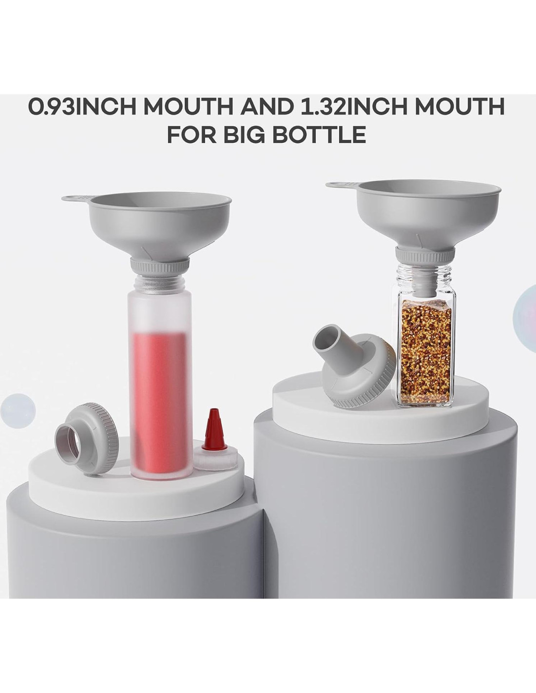 - 5 Tamaños de Boca: El embudo de boca ancha tiene 5 picos de tamaño. Pico de 2'' (5,08 cm) para frascos de conservas; pico de 1.32'' (3,35 cm) para botellas de compresión y bolsas; pico de 0.93'' (2,36 cm) para frascos de especias; pico de 0.67'' (1,70 cm) para botellas de aceite y azúcar; pico de 0.44'' (1,12 cm) para botellas de dispensadores de espuma