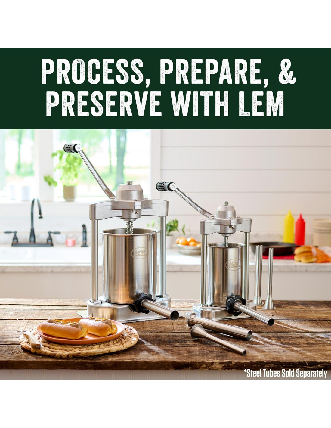 LEM Products Mighty Bite Vertical Stainless Steel 5 Libras Capacidad Embutidora de Salchichas con Tubos de Relleno de Plástico
