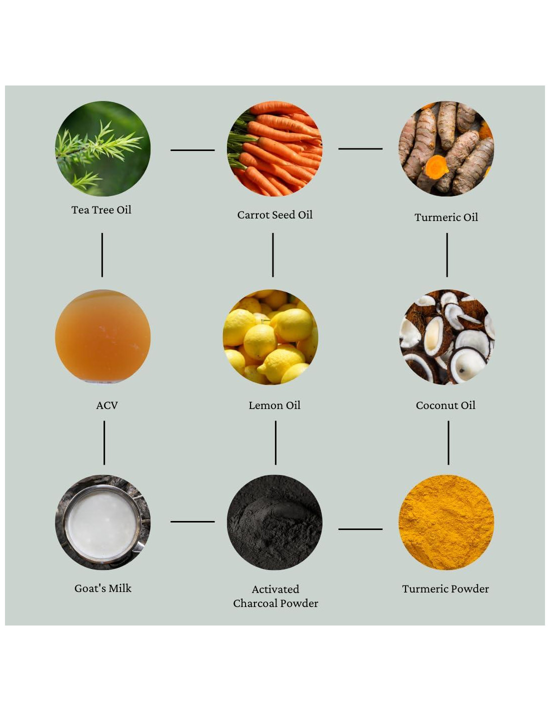 - INGREDIENTES NATURALES: Jabón hecho a mano que presenta polvo de cúrcuma, carbón activado, aceite de árbol de té, aceite de semilla de zanahoria y aceite de coco para una experiencia de limpieza nutritiva