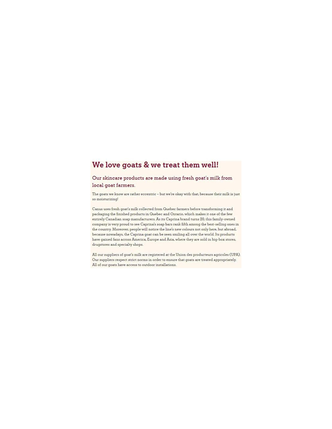 Desde 1998, el Laboratorio Canus ha desarrollado una técnica probada que transfiere los beneficios de la leche de cabra fresca a sus líneas de productos. La leche de cabra es reconocida por contener ácidos grasos hidratantes, vitaminas, potasio, zinc y selenio. La crema de leche de cabra es un hidratante natural para calmar la piel seca y dañada. Llena de nutrientes esenciales y vitaminas A, B2, B3, B6, B12, y E, y proteínas que alimentan la piel, contribuyendo a una hidratación profunda y prolongada. ¡Todos esos beneficios están encapsulados en nuestros productos de cuidado de la piel con leche de cabra! Nuestro jabón se elabora mediante saponificación tradicional y limpia tu piel sin secar ni alterar su barrera de hidratación natural. Nuestra receta de menta eucalipto es un imprescindible para la relajación. Inhala, exhala y observa cómo tus preocupaciones se desvanecen.