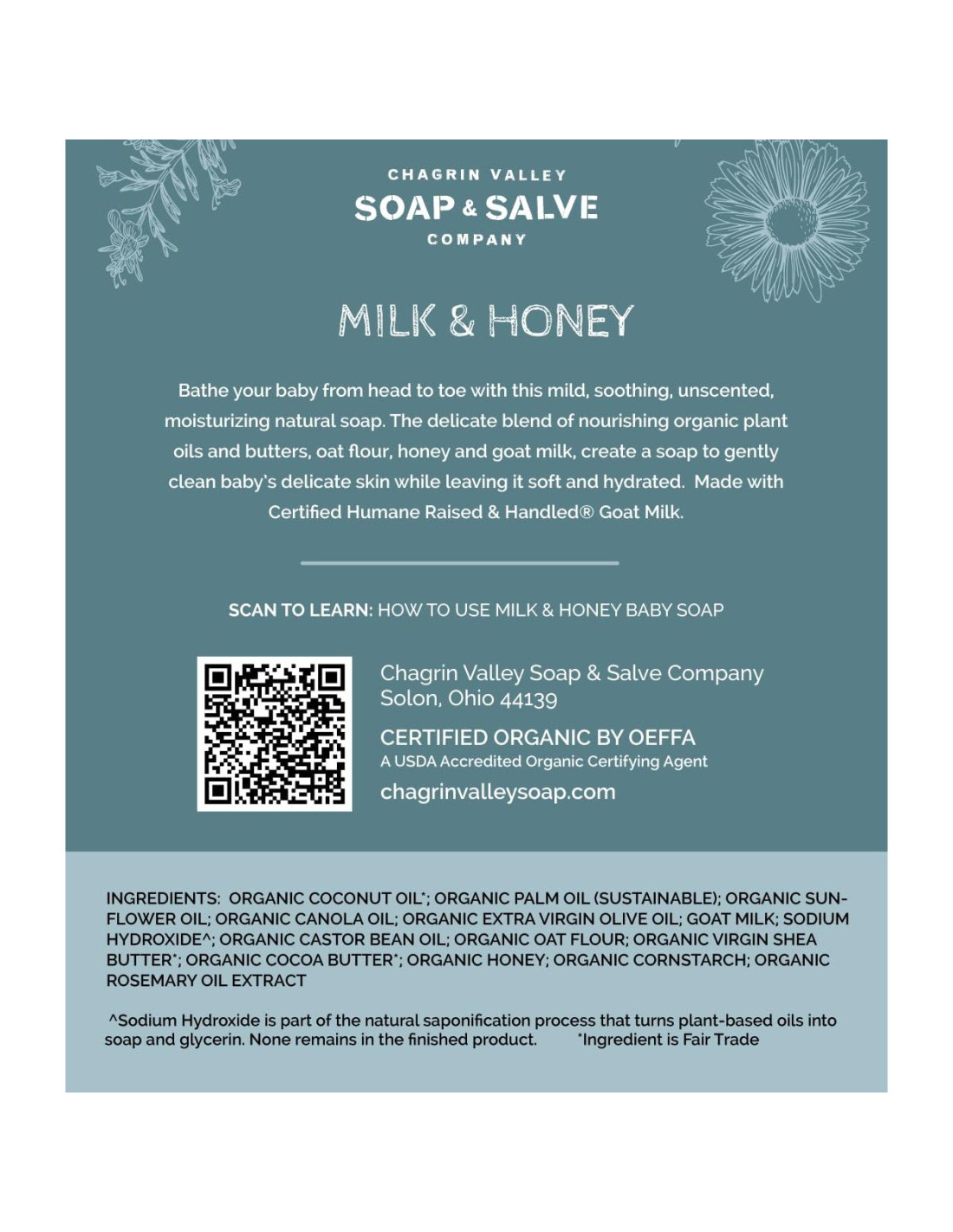 Los Jabones de Chagrin Valley son hechos a mano desde cero, utilizando el método de proceso en frío, un lote a la vez, para asegurar frescura y perfección. Cada jabón tiene su propia receta única. El nivel de cuidado y atención que se pone en la producción de un lote de jabón natural para cuerpo y manos de proceso en frío es incomparable con los jabones comerciales. Desde su composición hasta sus beneficios para la piel y la salud, hasta su impacto en el medio ambiente, nuestro jabón natural esencial para el baño del bebé es muy diferente del jabón comercial. Nuestras recetas utilizan ingredientes sostenibles, de comercio justo, libres de crueldad, naturales y orgánicos para producir un jabón suave y nutritivo para la piel, cargado de glicerina natural, que ofrece una magnífica espuma duradera y deja tu piel sintiéndose limpia, suave y saludable. Aromatizado con aceites esenciales botánicos puros y coloreado con arcillas naturales, jugos orgánicos y botánicos orgánicos como hierbas, especias, flores y polvos de raíz, el champú y jabón corporal natural de Chagrin Valley está hecho con ingredientes proporcionados por la Madre Naturaleza. Nuestro champú en barra para bebés contiene solo los ingredientes que necesita, sin conservantes adicionales que los jabones líquidos o las "barras de jabón" comerciales requieren para aumentar su vida útil a años, y sin potenciadores de espuma para hacer que hagan espuma. Los ingredientes sintéticos que se encuentran en jabones comerciales e incluso en algunas barras de jabón hechas a mano a menudo no son descomponibles. En cambio, a medida que se lavan por nuestros desagües, se acumulan en nuestros ecosistemas. Certificado "Hecho con Ingredientes Orgánicos" por OEFFA, un Agente Certificador Orgánico Acreditado por el USDA, significa que nuestros jabones naturales contienen: Disfruta de los aromas naturales y la aromaterapia, hidrata tu piel y siéntete bien con lo que pones en tu cuerpo, mientras limpias tu piel con Jabón Natural de Chagrin Valley.