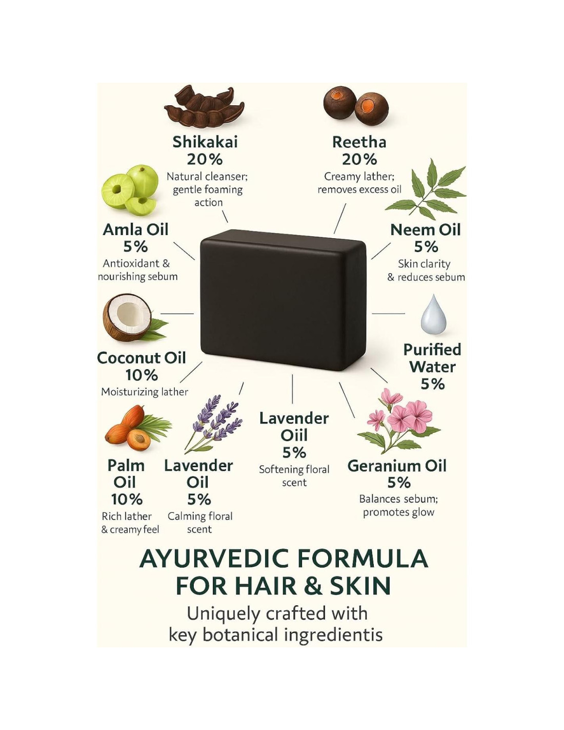 - 40% Shikakai y Reetha - Base Herbal Tradicional Elaborada con 20% Shikakai y 20% Reetha, este jabón ayurvédico limpia suavemente la piel y el cuero cabelludo mientras mantiene el equilibrio del pH. Estas hierbas indias probadas en el tiempo son conocidas por purificar, exfoliar y apoyar una piel y cabello claros.