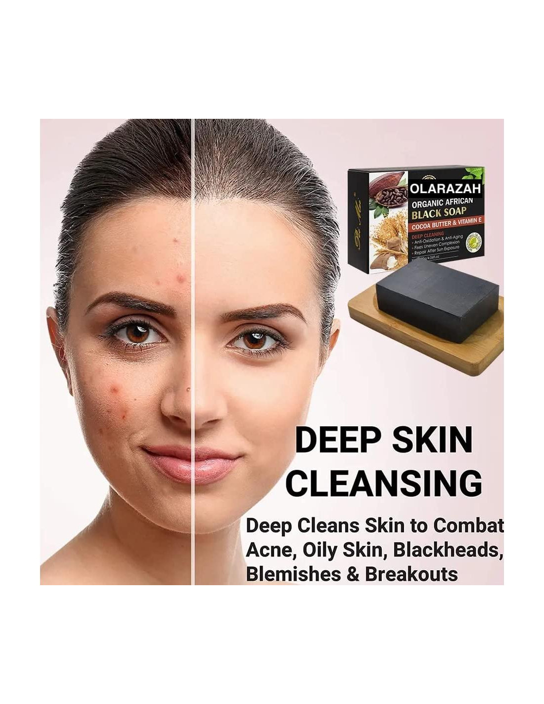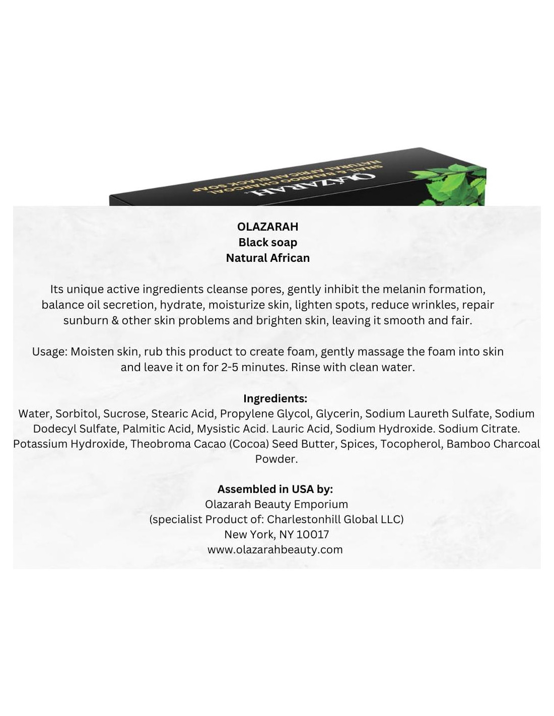 Nuestro Jabón Negro Africano Natural está enriquecido con una lujosa mezcla de Aceite de Aguacate y Aceite de Argán, proporcionando beneficios de hidratación y nutrición profunda. Infundido con Manteca de Cacao y Vitamina E, mejora la suavidad y elasticidad de la piel mientras promueve un cutis radiante. La adición de Carbón de Bambú asegura una exfoliación suave, eliminando eficazmente las impurezas y dejando tu piel sintiéndose fresca y suave. Esta formulación única combina la sabiduría tradicional del cuidado de la piel africano con ingredientes premium para una experiencia verdaderamente rejuvenecedora.
