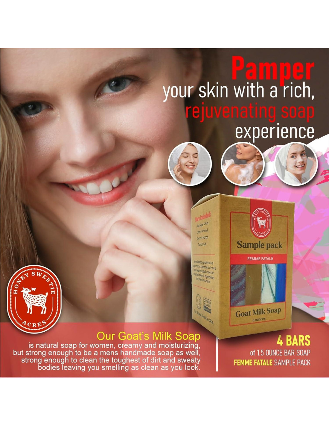 - Tratamiento de Tahití - Tropical y Jugoso: Una vibrante mezcla de piña, mango, fruta de la pasión y coco con notas florales de plumeria. Esta barra de leche de cabra cremosa ofrece una rica y hidratante espuma con una fragancia exótica de isla.