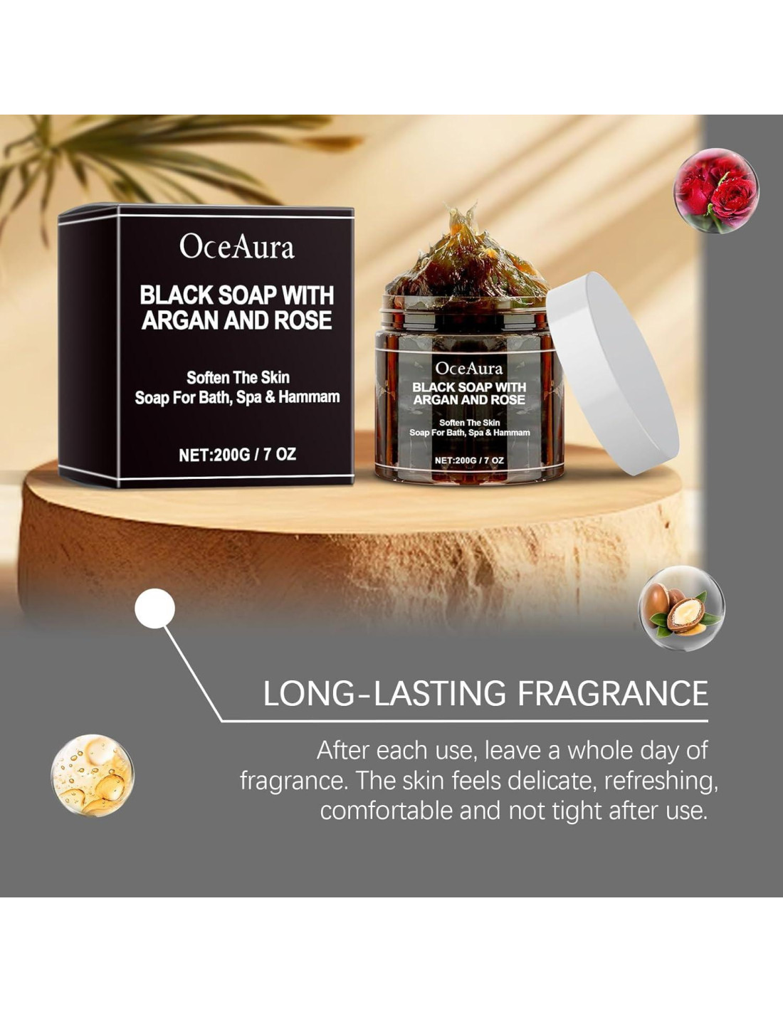 - Jabón Negro con Aceite de Argán y Rosa: Jabón negro lujoso que proporciona una limpieza suave pero completa sin irritación, perfecto para rutinas diarias de cuidado de la piel