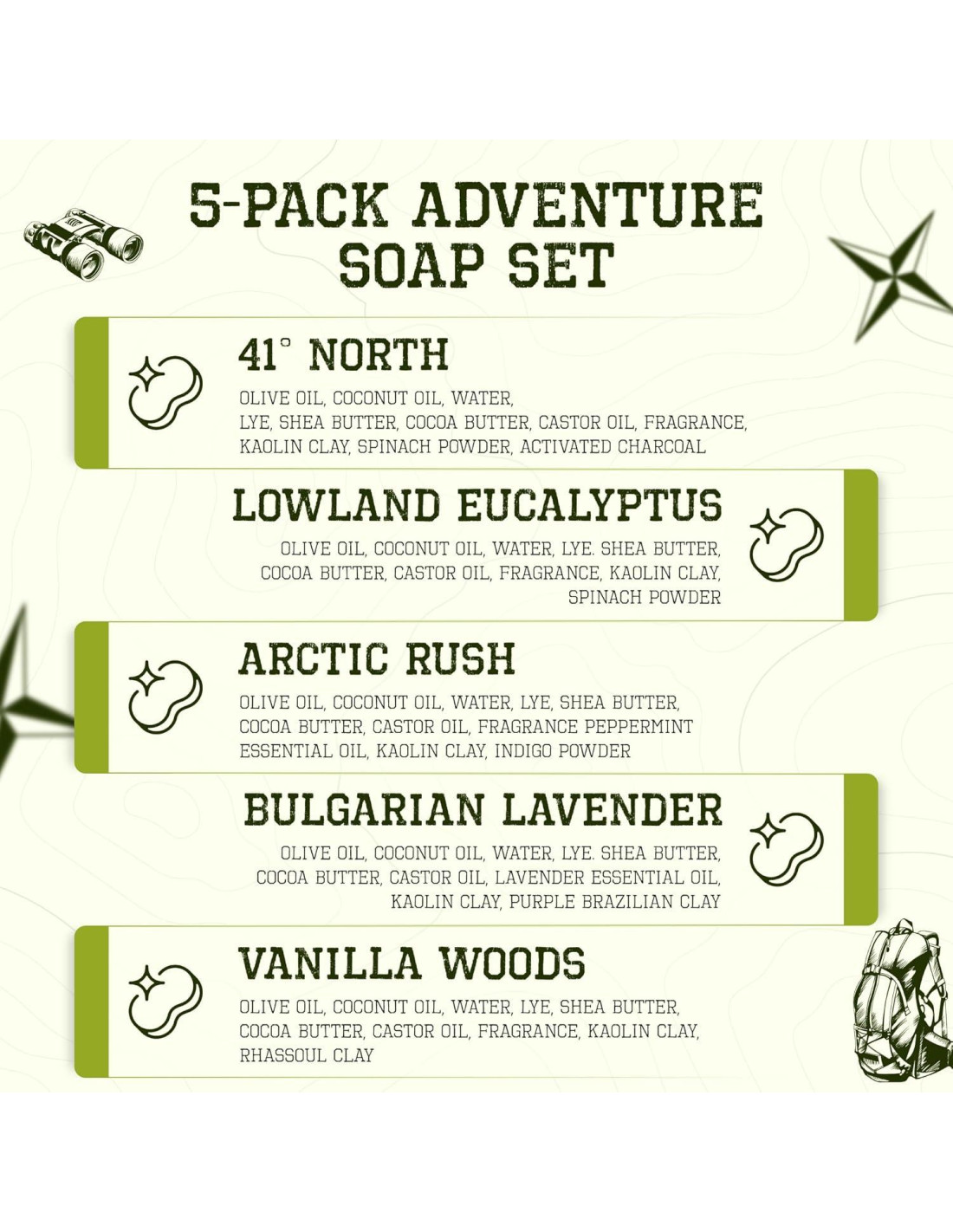 - VARIEDAD DE AROMAS: Mejora tu cuidado personal con una mezcla de aromas audaces en nuestro paquete variado, que incluye 41 Norte, Eucalipto de Tierras Bajas, Rush Ártico, Lavanda Búlgara y Maderas de Vainilla. Este set de jabones en barra para mujeres y hombres es una adición perfecta a tu rutina diaria.