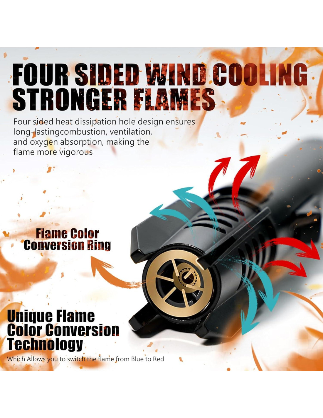 - 2. Llama Ajustable por Rotación. Nuestro encendedor de butano cuenta con un anillo de conversión de color de llama Jet en la boquilla, puedes ajustar el tamaño de la llama fácilmente sin herramientas, lo que te permite cambiar la llama de azul a rojo.