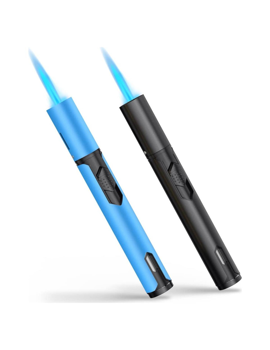 - [ENCENDEDORES DE ANTORCHA RECARGABLES Y AJUSTABLES] Este encendedor de antorcha tipo bolígrafo es recargable. Ajuste fácilmente la llama girando la perilla de ajuste de llama debajo del encendedor, puede usar su mano para ajustar el nivel de llama directamente, la gran perilla de ajuste de llama hace que sea más fácil y conveniente establecer la altura de la llama de baja a alta.