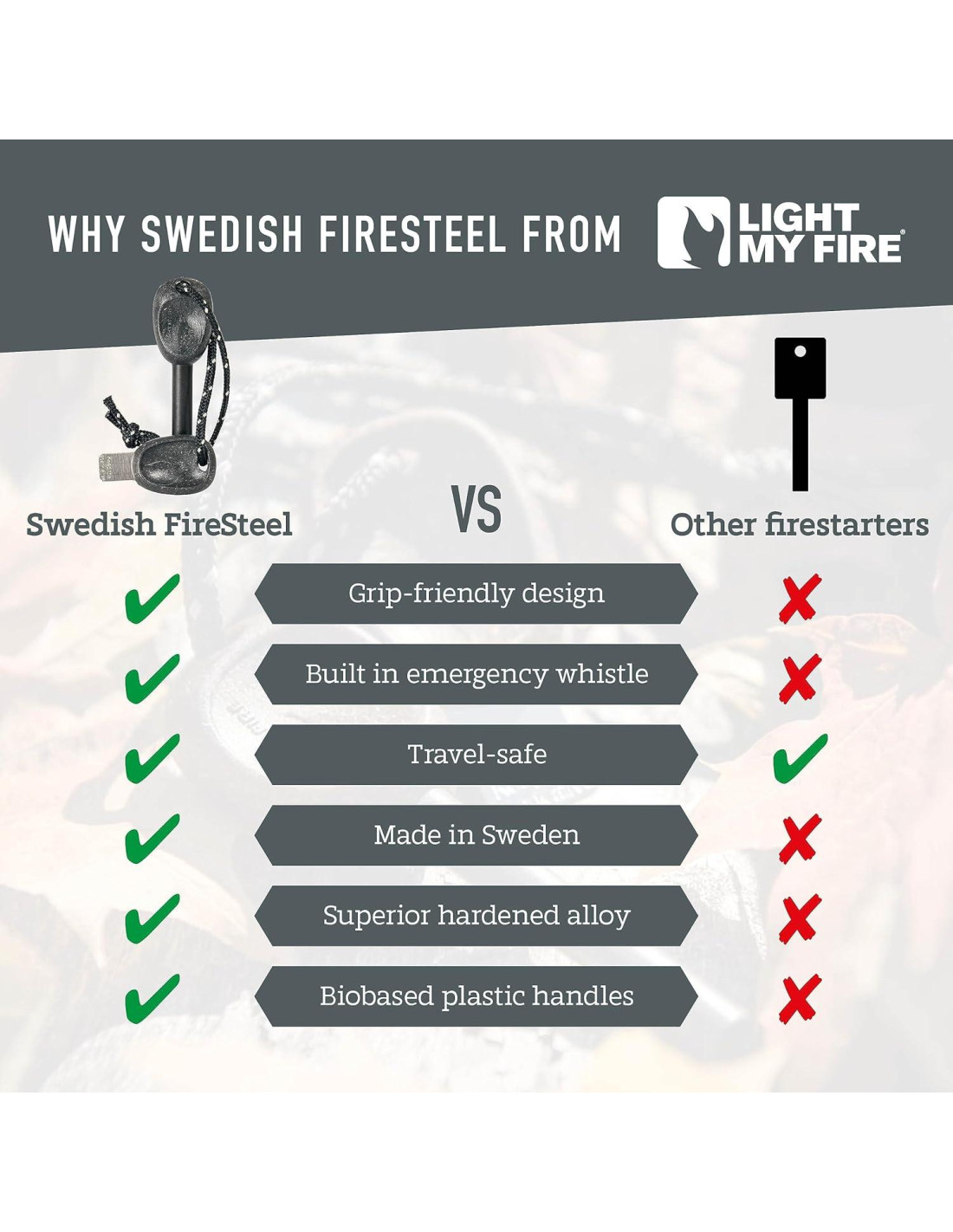 - HERRAMIENTAS DE FUEGO SWEDISH ARMY FIRESTEEL de Light My Fire son de estándares de grado militar y están fabricadas en Suecia. Somos los originales y nuestro equipo y accesorios de supervivencia son de calidad premium. Reconectamos a los humanos con la naturaleza para crear un planeta sostenible.