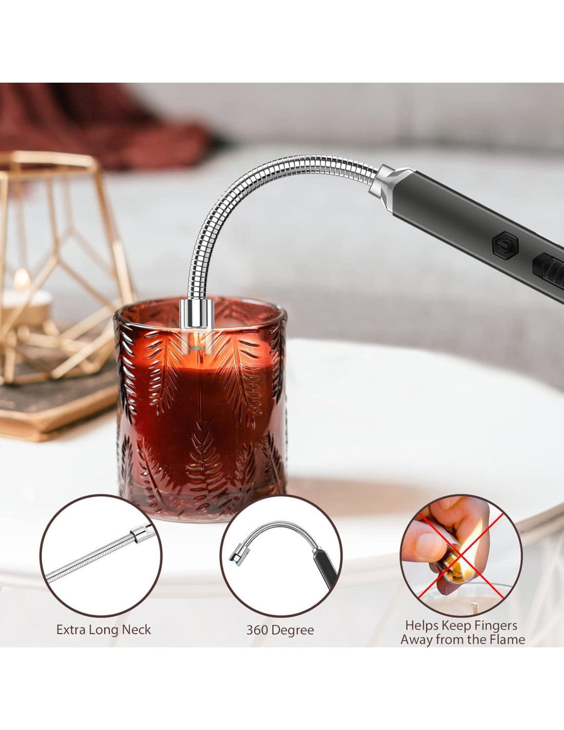 - Cuello Flexible Más Largo y Ligero: Nuestro encendedor eléctrico largo tiene un cuello flexible para velas. Puede rotar fácilmente 360 grados para cualquier ángulo de encendido. Su tamaño ligero es adecuado para uso diario en interiores y exteriores
