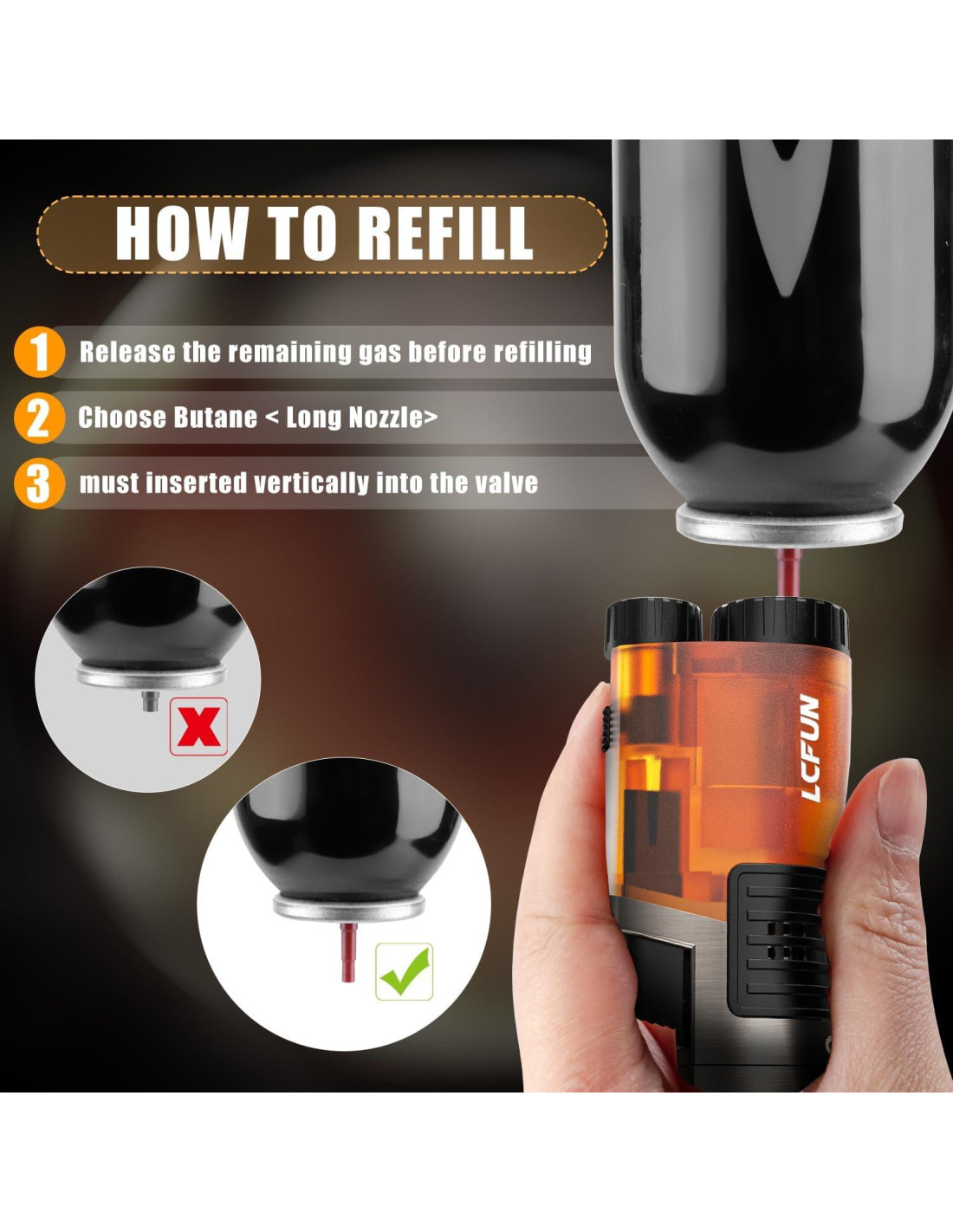 - LLAMA DE ANTORCHA TRIPLE PODEROSA: El encendedor de antorcha LcFun consiste en 3 quemadores que pueden producir una ignición concentrada y consistente, altamente resistente al viento, la luz de antorcha triple es más rápida y eficiente que los modelos de llama simple o dual. NOTA: TODOS LOS ENCENDEDORES SE ENVÍAN SIN BUTANO. POR FAVOR, LLENE CON COMBUSTIBLE ANTES DE USAR