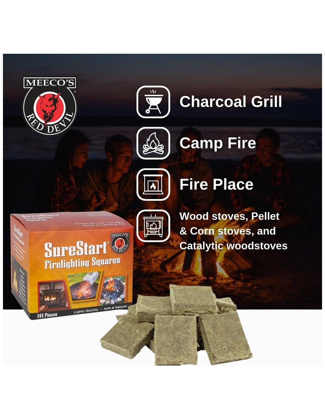 Descripción del Producto ¿Necesitas encender tu fuego rápidamente? Los Cuadrados para Encender Fuego de MEECO'S RED DEVIL se encienden rápida y fácilmente y arden de 8 a 12 minutos, ¡incluso cuando están mojados! Son no explosivos, no tóxicos (no darán sabor a la comida) y no producen llamas peligrosas. ¡Ideales para parrillas de carbón, chimeneas, estufas de leña y pellets, incluso fogatas! Cumplen con la Regla 1174 del Distrito de Gestión de Calidad del Aire de la Costa Sur ref. C58. Del Fabricante ¿Necesitas encender tu fuego rápidamente? Los Cuadrados para Encender Fuego de MEECO'S RED DEVIL se encienden rápida y fácilmente y arden de 8 a 12 minutos, ¡incluso cuando están mojados! Son no explosivos, no tóxicos (no darán sabor a la comida) y no producen llamas peligrosas. ¡Ideales para parrillas de carbón, chimeneas, estufas de leña y pellets, incluso fogatas! Cumplen con la Regla 1174 del Distrito de Gestión de Calidad del Aire de la Costa Sur ref. C58.