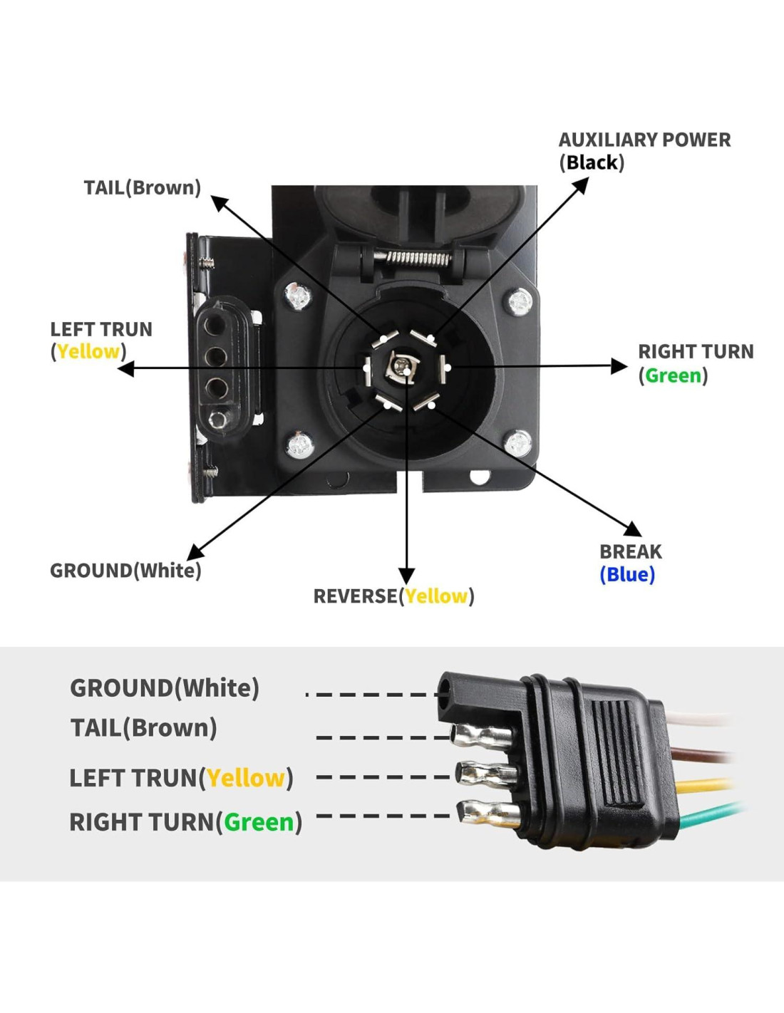 - Resistente: Adaptador eléctrico de remolque de 7 vías para RV y 4 vías para remolque equipado con cubierta de polvo y tapa de resorte para mantener los terminales limpios; Hecho de plástico grueso reforzado; Enchufe de remolque sellado con silicona y sello interno para una máxima impermeabilidad.