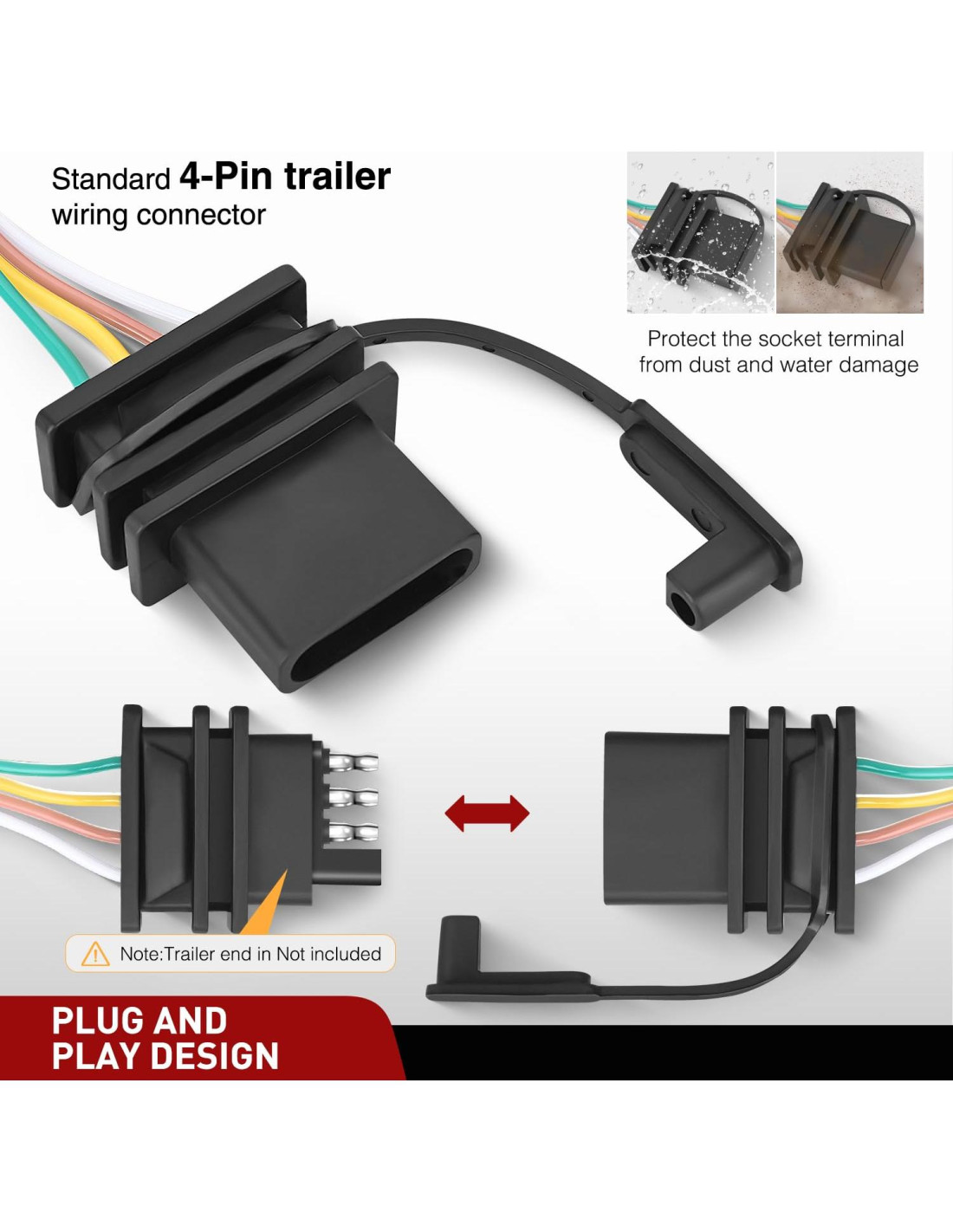 - FÁCIL DE INSTALAR: No se requiere cortar ni empalmar el cableado de fábrica. Arnés plug and play. Este kit de arnés de cableado para remolque se conecta al cableado de fábrica existente en su vehículo y lo equipa con un conector de cableado de remolque trasero de 4 pines estándar para enchufar y remolcar un remolque