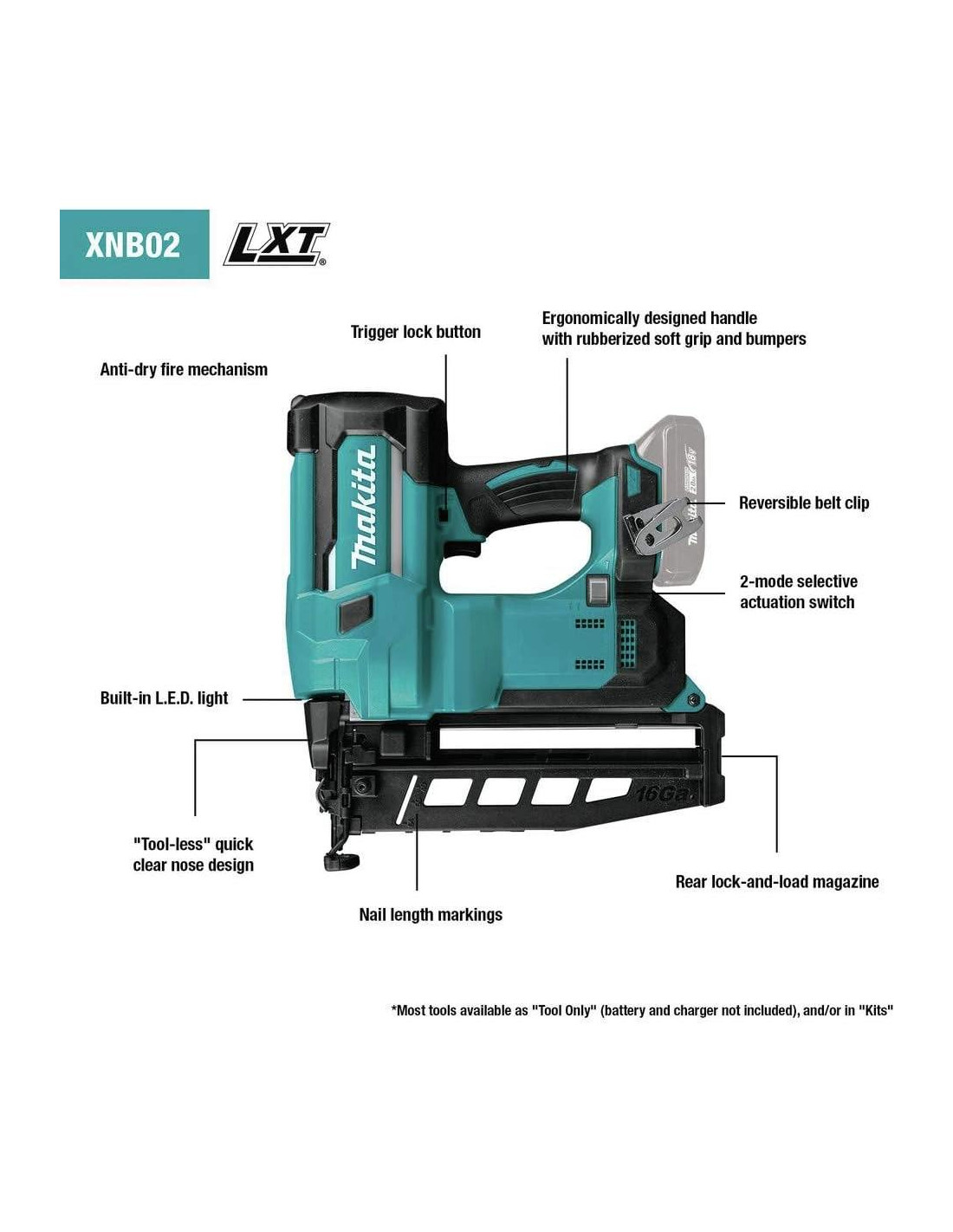 - Clava hasta 1,000 clavos de acabado usando una batería de 5.0Ah 18V LXT (batería no incluida)