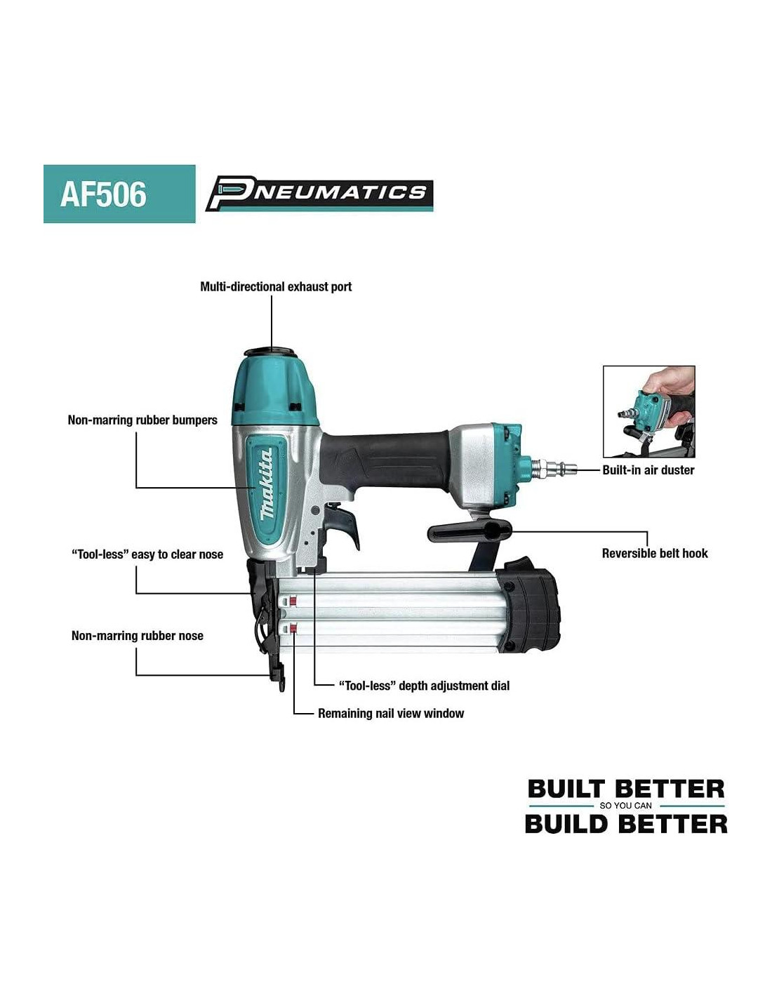La Clavadora de Brad de 18 Gauge de 2 pulgadas de Makita (modelo AF506) presenta un diseño duradero y compacto con características de facilidad de uso, incluyendo un diseño de nariz estrecha que la hace ideal para una amplia variedad de aplicaciones de acabado. La AF506 puede operar de 70 a 120 PSI, y clava una gama de clavos de brad de 18 gauge de 5/8" (1.59 cm) a 2 pulgadas (5.08 cm), y tiene una capacidad de magazine de hasta 100 clavos. La pieza de nariz fundida y mecanizada está diseñada para un contacto preciso con la pieza de trabajo, con una nariz de goma no marcante diseñada para proteger la superficie de trabajo. Otras características incluyen un diseño de nariz ultra estrecha que es ideal para fijar en áreas confinadas, y un conveniente dial de ajuste de profundidad "sin herramienta" que se puede ajustar para una amplia variedad de aplicaciones de acabado. Para mayor comodidad, el puerto de escape multidireccional rota 360 grados para dirigir el aire de escape lejos del usuario. La AF506 está diseñada para clavar una gama de clavos de brad de 18 gauge de 5/8" (1.59 cm) a 2" (5.08 cm) en aplicaciones de madera dura o blanda y es ideal para trabajos de molduras, instalación de zócalos y molduras de corona, pisos y otras aplicaciones de carpintería.