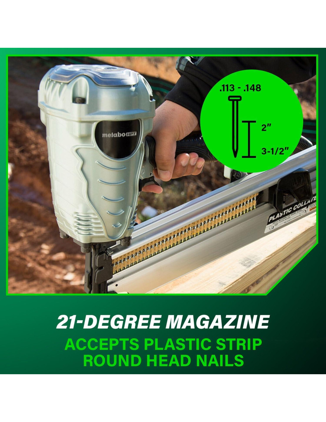 La clavadora de estructura NR90AES1 impulsa clavos plásticos colocados de 5.1 cm hasta 8.9 cm de longitud y cuenta con el "diseño industrial" de nueva generación de Metabo HPT. Con un peso de solo 3.4 kg, esta clavadora de estructura es fácil de usar todo el día, mientras proporciona la potencia similar a otras clavadoras de estructura más voluminosas y pesadas. La clavadora de estructura NR90AES1 es ideal para pisos y enmarcados, construcción de armazones, construcción de ventanas, subpiso, cubiertas de techo, revestimiento de paredes y construcción de viviendas. La cabeza rediseñada de la clavadora de estructura NR90AES1 permite un proceso de desensamblaje más rápido y fácil, ahorrando tiempo valioso durante el mantenimiento de la herramienta.