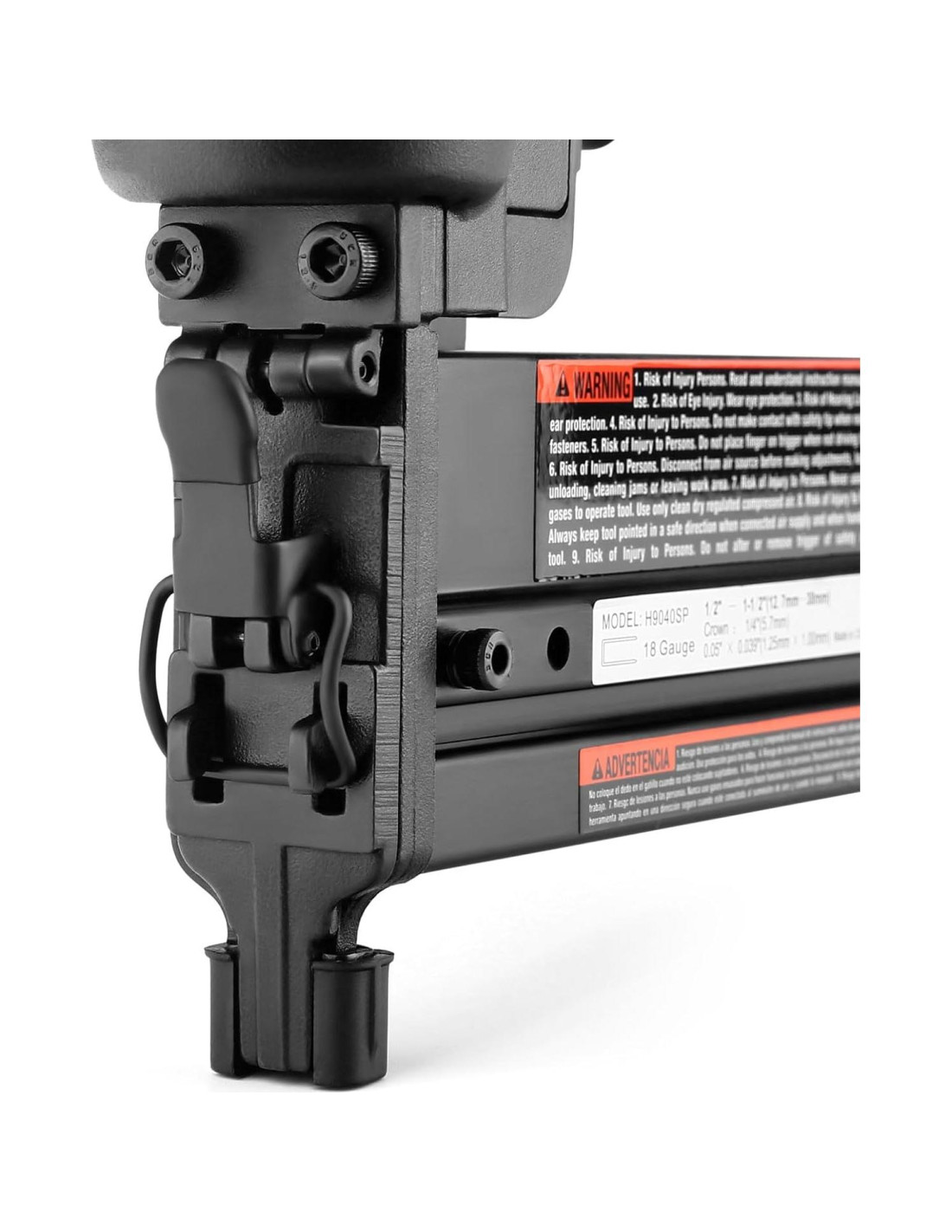 La grapadora de corona estrecha es la elección perfecta para molduras decorativas, respaldo de armarios, marcos de fotos, manualidades y pasatiempos. Presión de operación: 60-120 PSI (4.1-8.3 bar) Solo use aire comprimido limpio, seco y regulado a 60 a 120 PSI (4.1-8.3 bar). Nunca use oxígeno, dióxido de carbono, gases combustibles o cualquier otro gas en botella como fuente de energía para esta herramienta. Esta grapadora de aire impulsa grapas de corona estrecha de 18 calibre de 1/4" de 1/2'' (1.27 cm) a 1-1/2" (3.81 cm) Capacidad de carga (pcs): 100