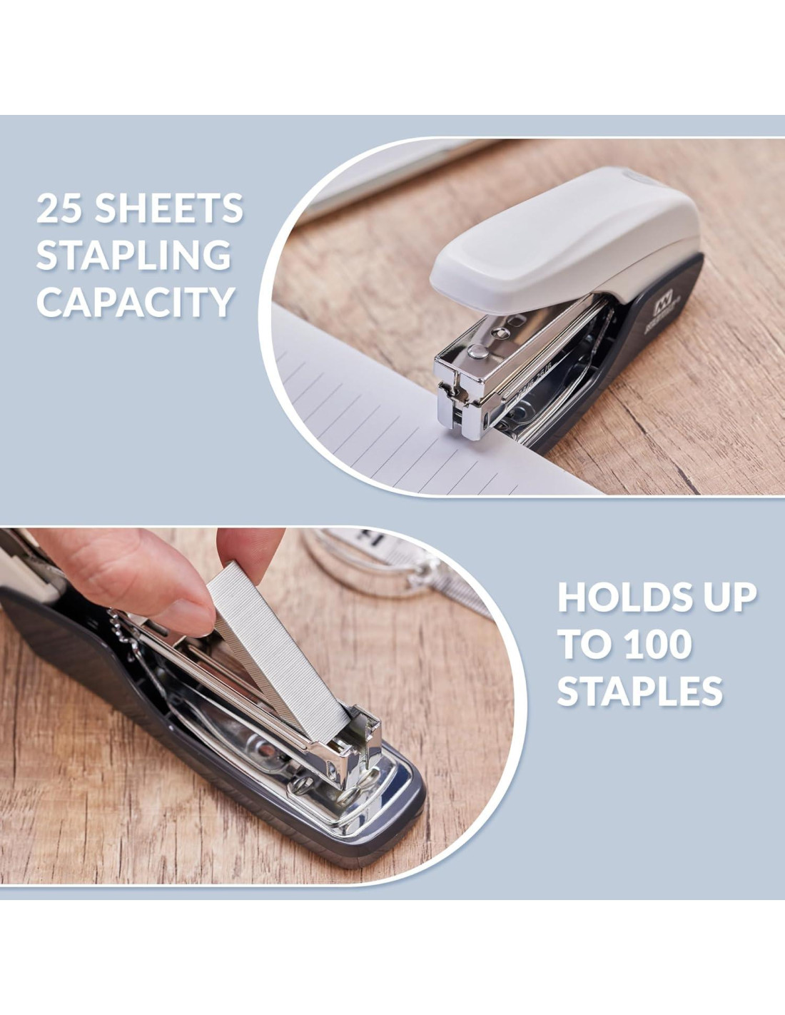 - Capacidad de 30 Hojas: Con una capacidad para sostener hasta 100 grapas estándar para grapadoras de escritorio. El diseño simple y elegante de la grapadora blanca añade profesionalismo