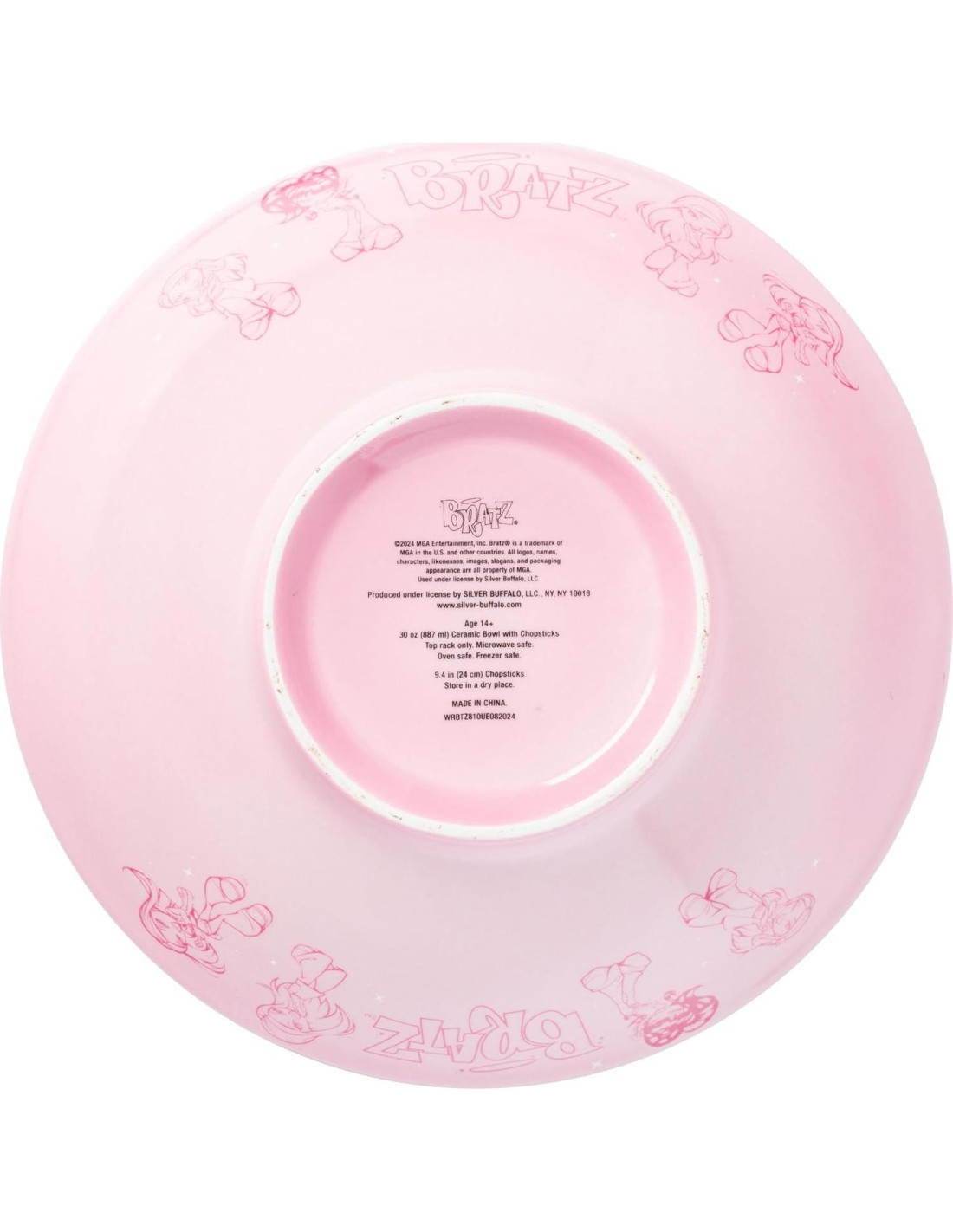 Disfruta de un humeante cuenco de ramen con un toque de actitud en este cuenco de 30 onzas! El icónico cuenco de ramen presenta a Cloe, Jade, Yasmin y Sasha contra un fondo rosa. Escrito en el centro del cuenco está 'Bratz.' El borde del cuenco presenta un patrón de cuadros rosa. El cuenco de ramen viene con palillos a juego. Esta adición hace que este artículo sea un conjunto imprescindible. Apto para microondas. El cuenco es SOLO apto para lavavajillas en la PARTE SUPERIOR. Los palillos son SOLO LAVADO A MANO. ¿Buscas el regalo perfecto? Este cuenco de ramen es una gran opción para cumpleaños y otras festividades. También es un regalo maravilloso y único para inauguraciones de casas para los fans de Bratz de todas las edades. Este cuenco de cerámica para ramen tiene una amplia abertura y se puede usar para arroz, sopa, fideos, helado, fruta, cereales y más! ¡Sumérgete en el mundo ficticio con Silver Buffalo! Silver Buffalo proporciona a los fans productos oficiales de sus personajes favoritos. Trabajando junto a licenciatarios y marcas, creamos productos únicos e imaginativos que están diseñados con gran cuidado y detalle. Silver Buffalo tiene como objetivo conectar a los fans con sus personajes de dibujos animados, superhéroes, películas, series de televisión y más. ¡Celebra tu afición!