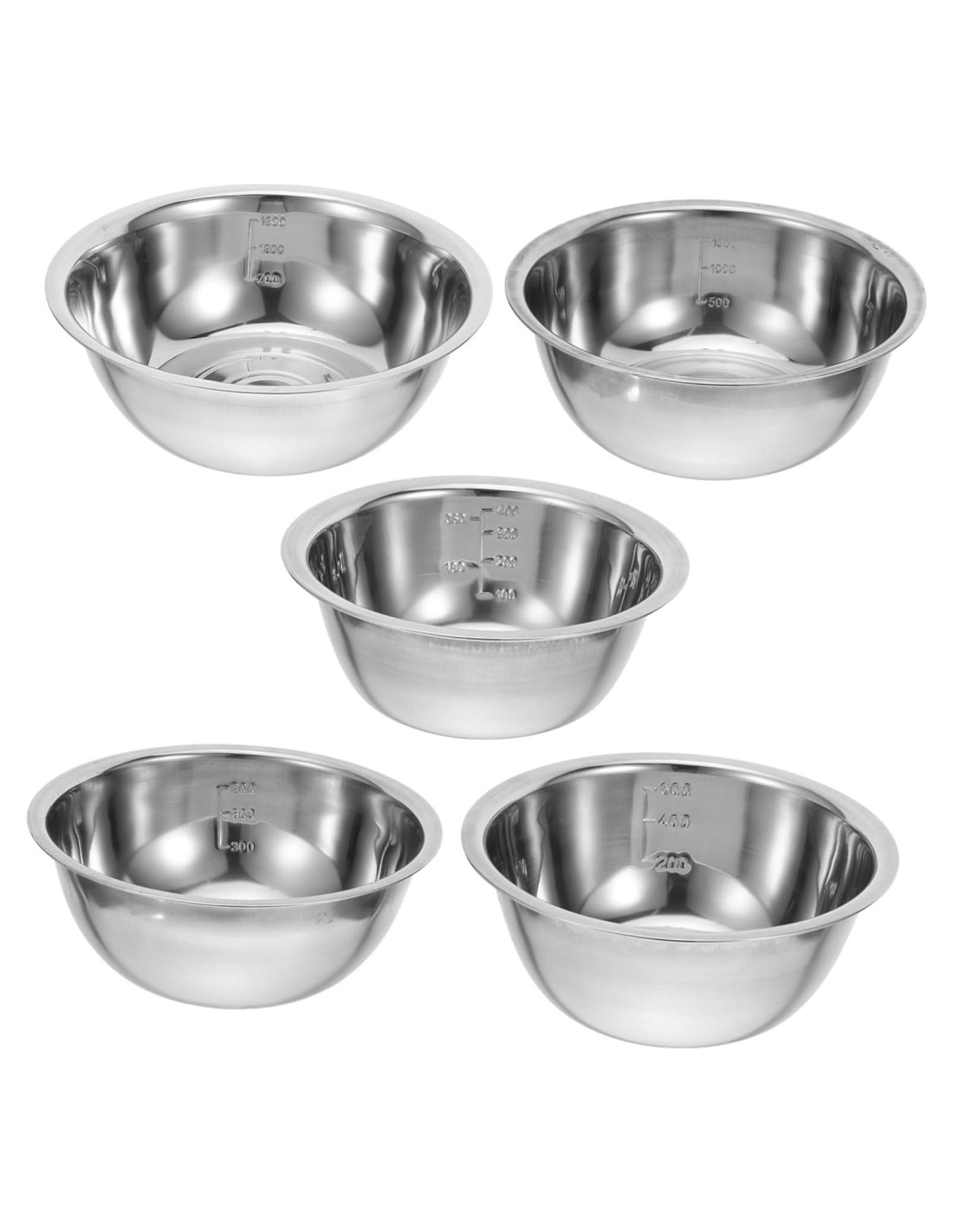 Paquete Incluye 5 x Cuencos de Mezcla de Acero Inoxidable Características -Tamaño: 24.00X24.00X8.50cm (9.43X9.43X3.34in) tazón de almacenamiento de acero inoxidable -Color: Acero inoxidable plateado -Medición precisa: las marcas de medición dentro de los cuencos te ayudan a medir ingredientes con precisión, mejorando tu precisión en la cocina cuenco para lavar frutas -Almacenamiento eficiente: el diseño apilable permite que los cuencos se almacenen de manera compacta, ahorrando espacio y manteniendo tu cocina organizada tazón de acero inoxidable -construcción robusta: hechos de acero inoxidable grueso, estos cuencos son resistentes a daños, asegurando un uso prolongado cuenco para lavar verduras -Material: Tazón de lavado de acero inoxidable -Tamaño: 22.00X22.00X8.00cm (8.65X8.65X3.14in) cuenco para servir ensaladas -Fácil de limpiar: estos cuencos son aptos para lavavajillas, lo que facilita su limpieza y mantenimiento, asegurando que siempre estén listos para usar cuenco para verduras -Juego de cocina completo: este conjunto de cuencos de acero inoxidable es ideal para mezclar, lavar, servir y almacenar, lo que lo convierte en una adición versátil a cualquier cocina cuenco tradicional chino para frutas -Tamaño: 14.00X14.00X5.50cm (5.50X5.50X2.16in) canasta para lavar frutas -Tamaño: 20.00X20.00X7.50cm (7.86X7.86X2.95in) cuenco de sopa de acero inoxidable -Tamaño: 16.00X16.00X7.00cm (6.29X6.29X2.75in) cuenco de lavado de acero inoxidable Descripción de los productos cuenco de acero inoxidable Este ayuda en tu proceso de cocina y mantiene tu cocina organizada y ordenada. cuenco de cocina de acero inoxidable ideal para la preparación de comidas, estos cuencos se pueden usar para organizar ingredientes antes de cocinar. tazón de almacenamiento de acero inoxidable Los diferentes tamaños te permiten separar y medir varios componentes de tu receta