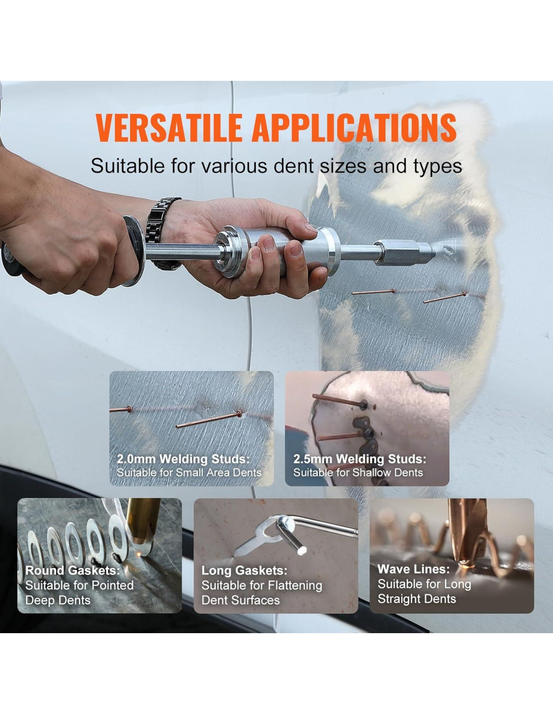 - Soluciones Versátiles para Diversas Reparaciones: Desde pernos de 2.0mm a 2.5mm, juntas redondas a largas, o líneas de onda, el kit de soldador de estudio de VEVOR es tu opción para reparaciones diversas. Restaura formas puntiagudas, abolladuras profundas, áreas planas, líneas rectas y curvas.