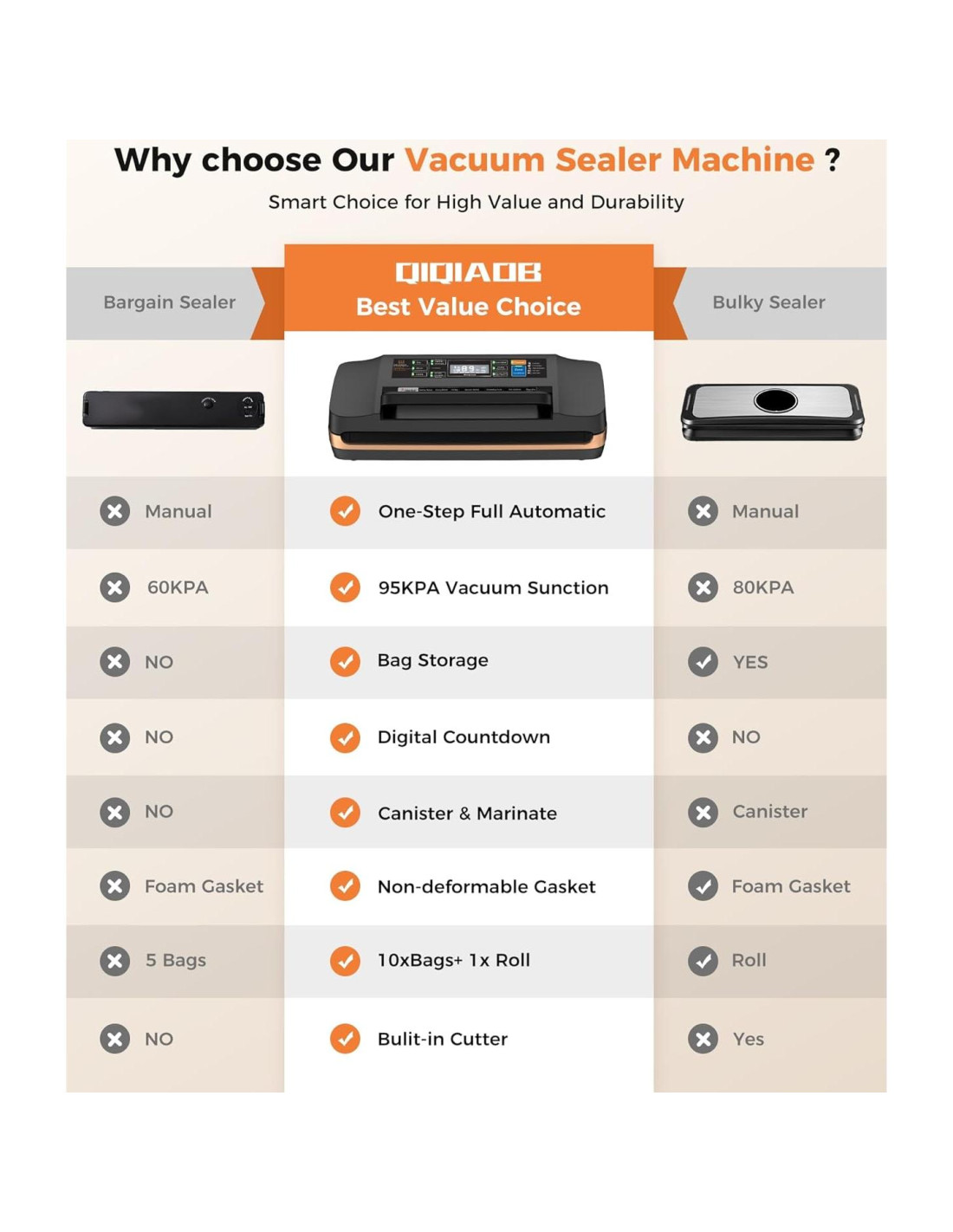 - [Almacenamiento y Cortador de Bolsas Integrado] Accede y personaliza fácilmente los tamaños de las bolsas, ahorrando tiempo y energía. Pantalla de Cuenta Regresiva - Proporciona retroalimentación en tiempo real sobre el progreso del sellado. Bandeja de Goteo Removible - Fácil de limpiar y mantener.