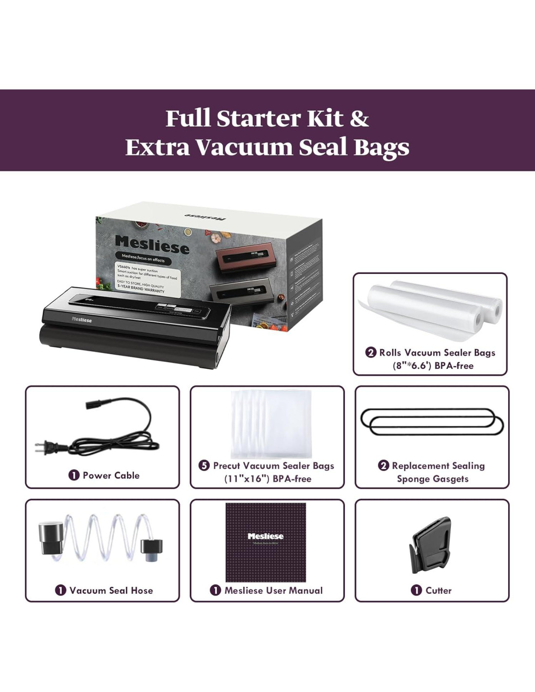 - Garantía Extendida de 5 Años. Recibirás 1 máquina de sellado al vacío, 2 rollos de vacío (8"x6.6' (20.3x16.8 cm)), 5 bolsas pre-cortadas (libre de BPA, 11"x16" (27.9x40.6 cm)), 1 manual de usuario, 1 manguera de succión de aire, 1 cable de alimentación AC, 2 esponjas/gaskets de sellado. Mesliese ofrece una garantía de 5 años con reembolso/reemplazo disponible. Estaremos encantados de ayudarte con cualquier problema.