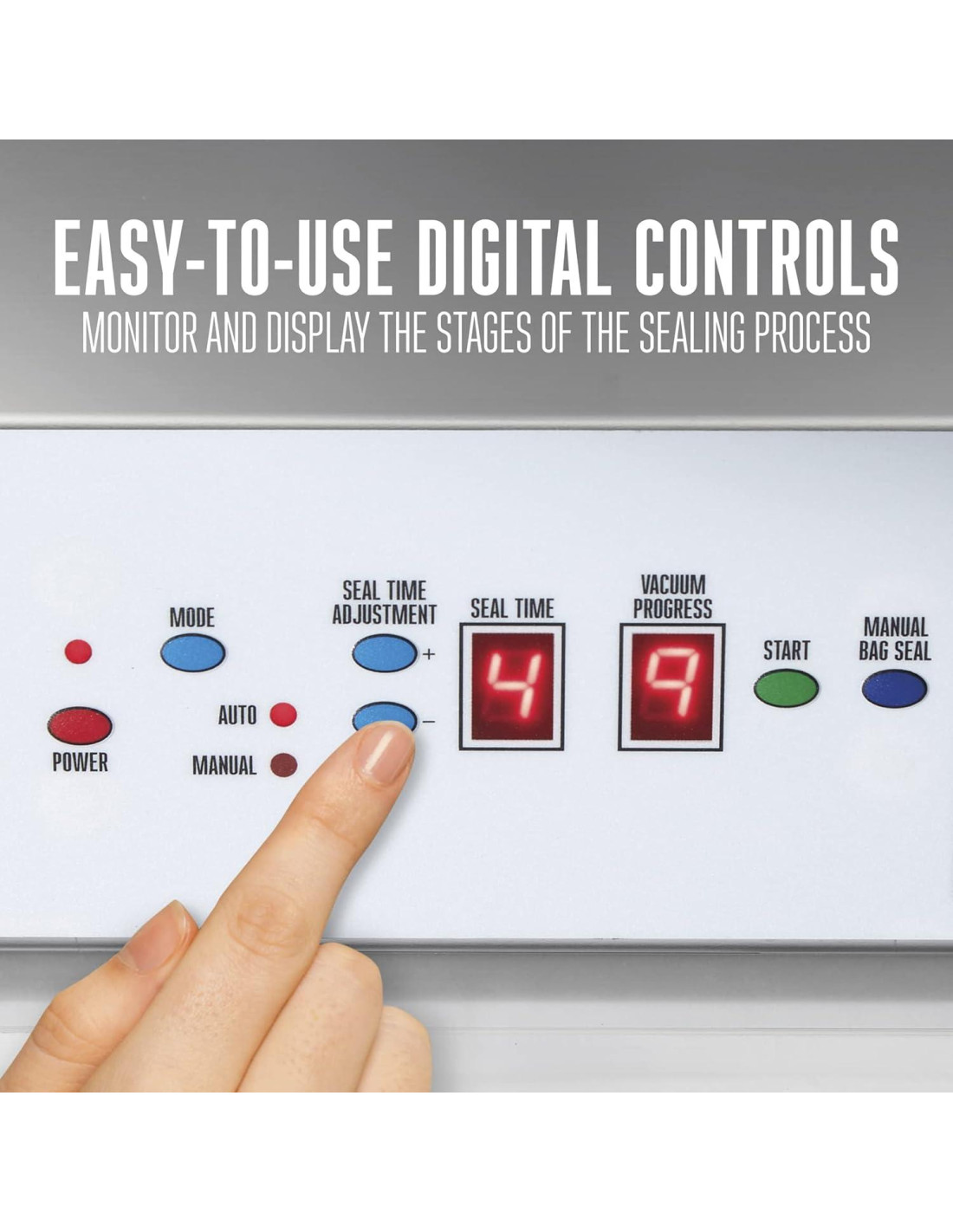 - CONTROLES DIGITALES: El sellador al vacío de alimentos es fácil de operar usando el panel de control digital con luces LED. Además de ser programable, puedes elegir modos automático o manual. El panel de control monitorea y muestra las etapas del proceso de sellado
