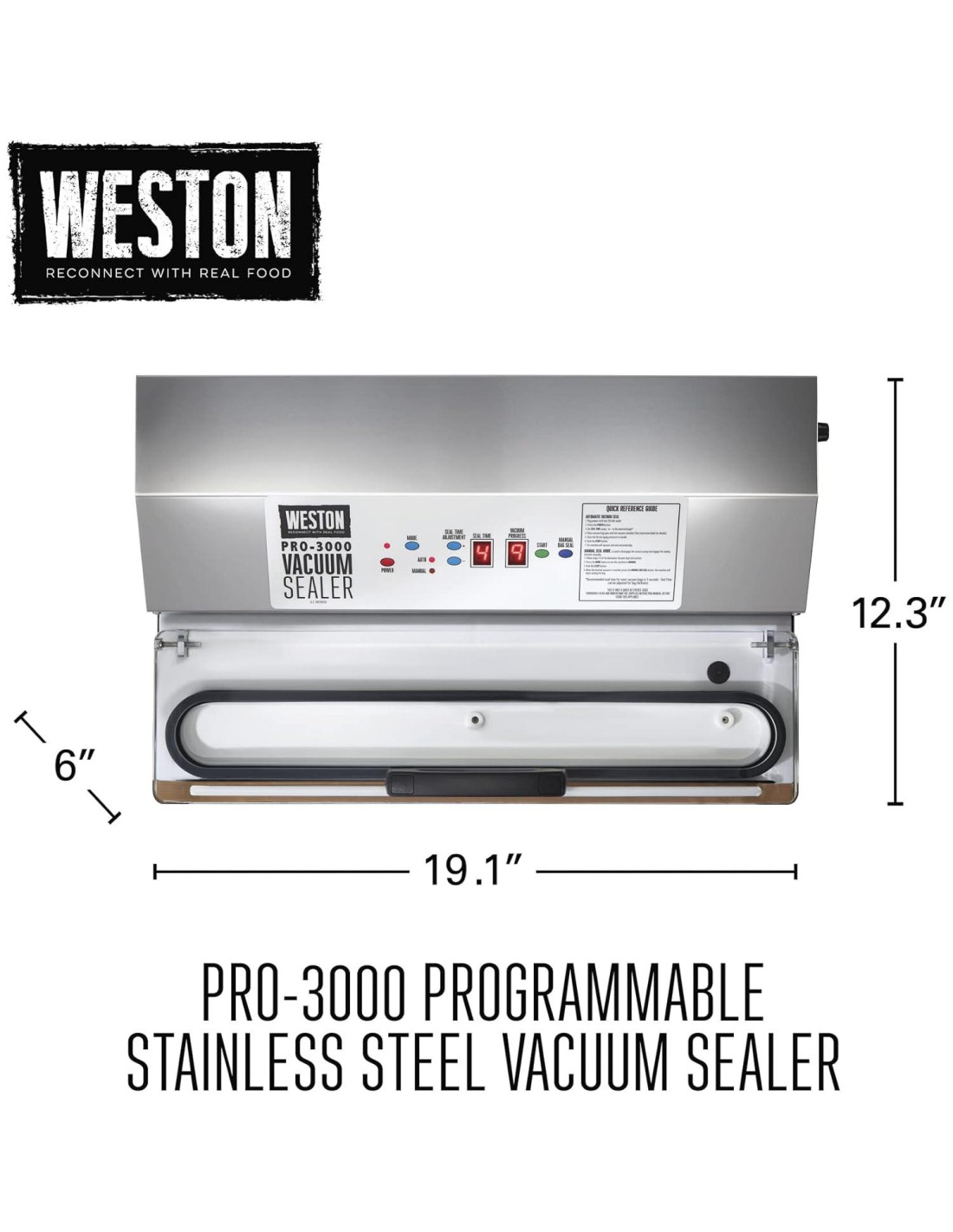 Productos Weston VacSealer PRO 3000 Acero Inoxidable 65-0401-W Capaz de 28 pulgadas (71,12 cm) de sellado al vacío que mantendrá los alimentos frescos de 5 a 6 veces más que los métodos de almacenamiento tradicionales. Capaz de sellar bolsas de hasta 15 pulgadas (38,1 cm) de ancho, este sellador es el más grande de la industria, ¡haciendo que cualquier trabajo grande sea pan comido!. Usando los mejores materiales y construcción industrial, esta máquina está diseñada para una vida útil y durabilidad. Características: - 935 watts (120 voltios, 60 Hz). - Barra de sellado de calor extra ancha para sellar bolsas de hasta 15" de ancho - Bomba de vacío de doble pistón que entrega hasta 28" HG de fuerza de vacío - Cable de alimentación desmontable y compartimento de almacenamiento conveniente - Luces LED que monitorean las etapas del proceso de sellado - Modo automático con operación simple de un toque y modo de sellado manual que permite controlar la cantidad de presión de vacío para sellar alimentos suaves u objetos delicados - Tapa de vacío de acrílico transparente para una alineación perfecta de la bolsa durante el sellado - Construcción de acero inoxidable (solo PRO-2300 y PRO-3000). - PRO-3000 tiene un panel de control digital fácil de usar.