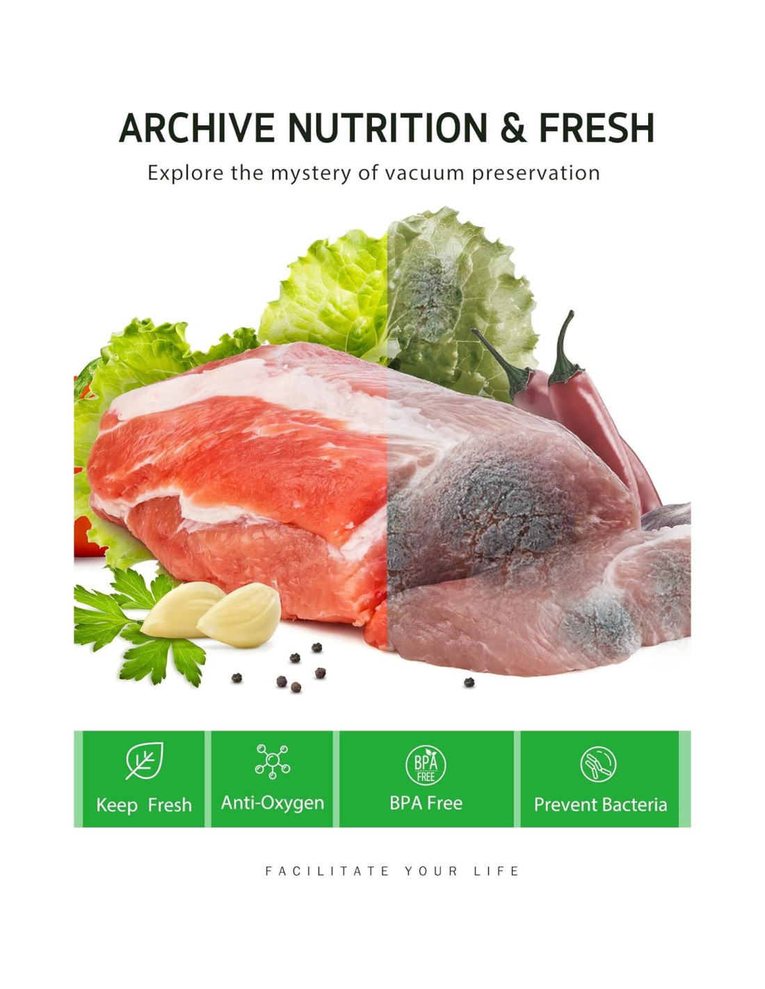 - Prevención de Punciones: Con un lado embosado que aumenta la succión y previene que los huesos perforen; material de alta tenacidad proporciona un ambiente aislado del aire y mantiene los alimentos frescos por más tiempo.