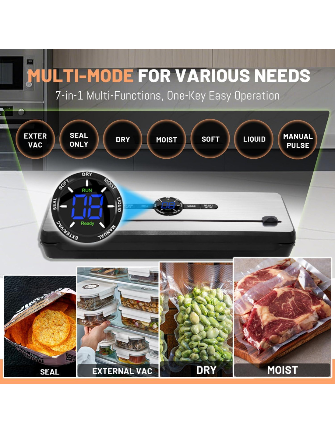 - [6-en-1 Multifuncional] Con un diseño compacto, esta máquina de sellado al vacío está equipada con múltiples funciones de vacío y sellado, incluyendo modo Húmedo/Seco, bombeo de vacío externo, sellado al vacío con una tecla, cortador incorporado, etc. Puedes elegir libremente la forma de almacenamiento de alimentos que necesites.