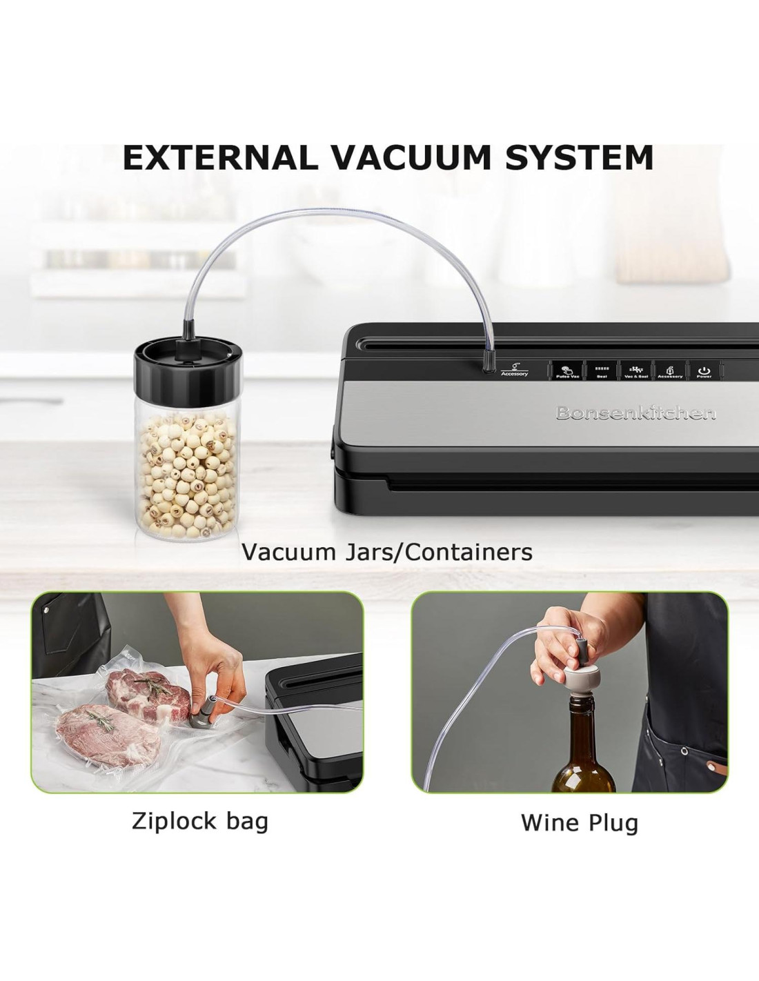 - Mantiene la Frescura en Segundos y Previene el Desperdicio: El sellado ultrarrápido de Bonsenkitchen mantiene los alimentos frescos 25 veces más tiempo - ¡sin quemaduras por congelación ni deshidratación! Diseñado para la eficiencia: Sella 35 bolsas en 15 minutos sin esfuerzo. Perfecto para la preparación de comidas, sous vide y conservación de carnes, productos, sobras y más