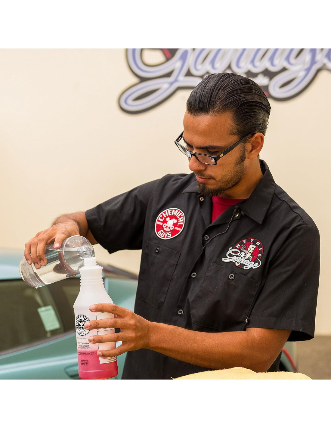 La botella y rociador resistente a productos químicos de grado profesional es una botella de spray resistente a productos químicos de grado profesional que presenta el nombre y el logo de Chemical Guys. Esta botella tiene una boquilla ajustable que rocía desde una fina niebla hasta un chorro. Esta botella cuenta con una durabilidad prolongada que se combina con una resistencia química premium. Esta botella puede funcionar con ceras en spray, limpiadores de alfombras, acondicionadores, limpiadores de ventanas e incluso acondicionadores a base de agua más espesos. El tallo mide 9-3/4 pulgadas (24.77 cm), tamaño para botellas de 32 onzas (0.95 L) - 12 onzas (0.35 L). Esta botella es ideal para usar, transportar y almacenar cualquier producto de detallado líquido. También es ideal para diluir productos. La botella está etiquetada, lo que facilita medir tus líquidos con precisión. Si necesitas diluir líquidos concentrados, la botella también tiene una práctica tabla a seguir en su lado con proporciones de dilución de 1-1 a 1-10.