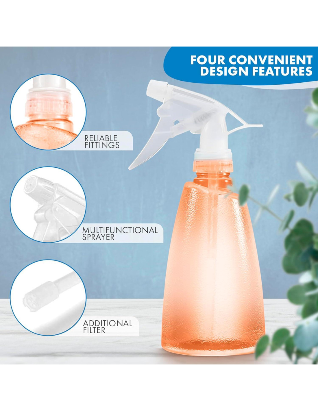 - Diseño Ergonómico: El diseño único del gatillo de las botellas de spray de alta resistencia permite un fácil descanso para los dedos y un agarre cómodo, eliminando la fatiga en la mano. El amplio espacio para los dedos asegura un agarre seguro de la botella de spray de agua para plantas durante su uso.