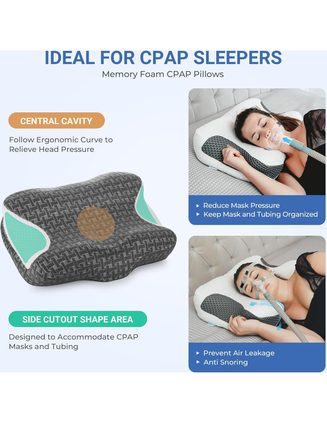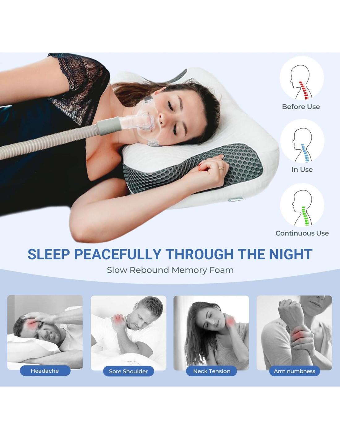 - Almohada CPAP Compatible con Varios Tipos de Máscaras CPAP: Esta almohada para cpap es adecuada para máscaras nasales u otros tipos de máscaras CPAP. Presenta cortes en ambos lados diseñados para ayudar a gestionar el equipo y la tubería de CPAP, minimizar fugas de aire y aliviar la presión facial de la máscara mientras apoya la alineación natural de la columna. Una almohada adecuada para almohadas nasales CPAP puede ayudar a reducir la incomodidad facial, prevenir enredos de tubería y disminuir las interrupciones nocturnas.