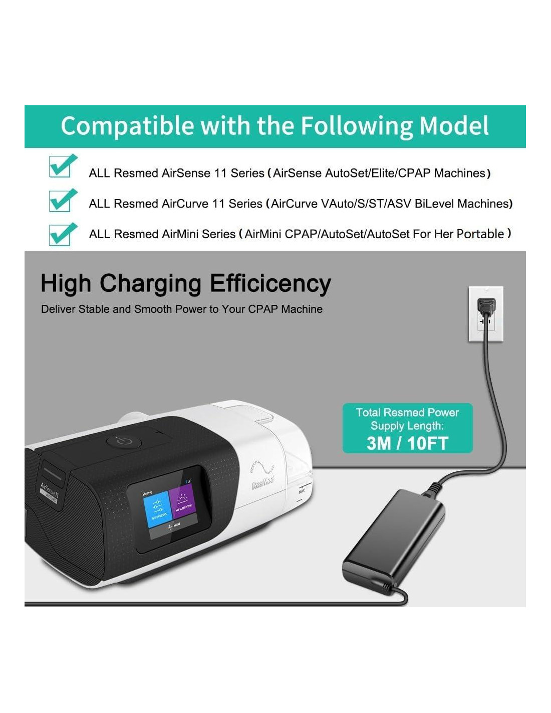 - [Elección de Amazon] Cargador para todas las máquinas CPAP o APAP Resmed AirSense 11 (AirSense 11 AutoSet / AirSense 11 Elite / máquinas CPAP AirSense 11, etc.). Funciona para toda la serie Resmed AirCurve 11 (Resmed AirCurve 11 VAuto / AirCurve 11 ASV / AirCurve 11 S / máquina Bilevel AirCurve 11 ST) y todas las máquinas CPAP portátiles de la serie Resmed Air mini. Reemplazo para el suministro de energía externo de 65 vatios de las máquinas CPAP Resmed Air11 S11 65W 39205 E1399 / ResMed 390010 R390-7230. También funciona para todas las máquinas CPAP Auto ResMed AirMini. Se adapta al cable de alimentación Resmed Airsense 11.