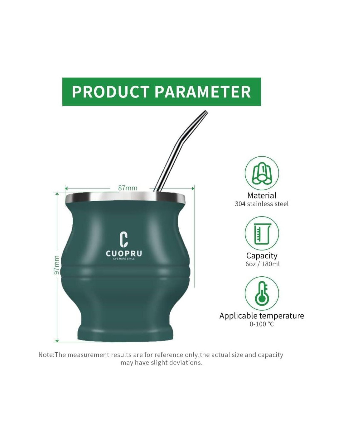 - El diseño principal de la taza de mate: Nuevo diseño ergonómico antideslizante de calabaza de yerba mate. Todas las partes de la taza de té de yerba mate CUOPRU y el colador están hechas de acero inoxidable 304 de doble pared de alta calidad que es apto para alimentos, lo que puede prevenir diferentes tipos de corrosión y no se oxidará.