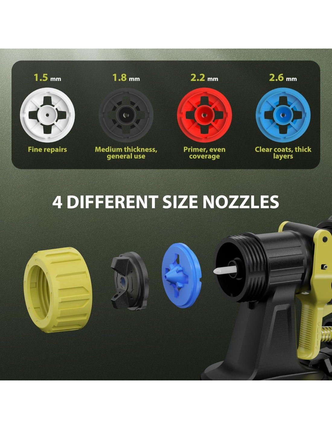 - [Boquillas y patrones de pulverización versátiles] Este pulverizador de pintura hvlp cuenta con cuatro tamaños de boquilla (1.5mm, 1.8mm, 2.2mm, 2.6mm) y tres patrones de pulverización (horizontal, vertical, circular), lo que le permite funcionar como una pistola pulverizadora de pintura para detalles finos en muebles o como una pistola pulverizadora de pintura eléctrica para superficies grandes como paredes y gabinetes.