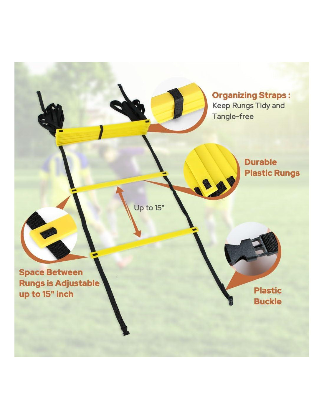 - Mejora el Rendimiento y las Habilidades: Esta escalera de entrenamiento de velocidad es una gran herramienta para mejorar la rapidez a través de un golpe de pie acelerado y frecuencia de levantamiento. También puede ayudar a perder peso ya que puede QUEMAR CALORÍAS en gran medida.