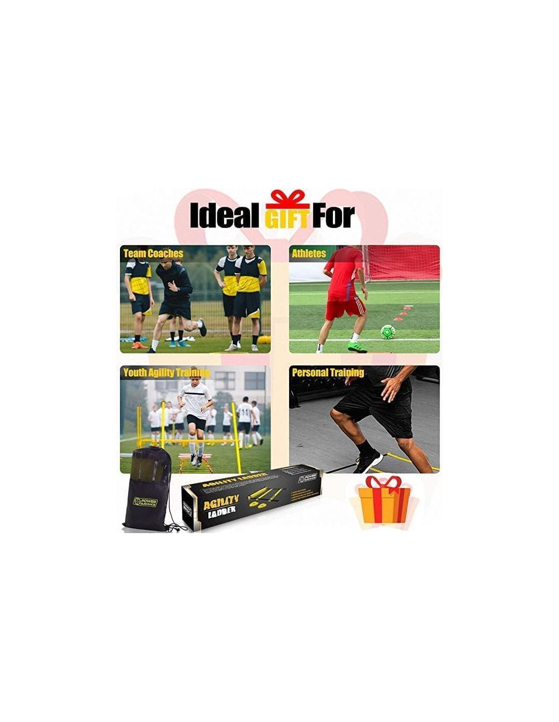 - Diseñada para durar años: Escalera de agilidad de 6.1 metros de largo con 12 peldaños de plástico de alta resistencia ajustables, 4 estacas, anillas en D, bolsa de transporte y 10 conos deportivos.