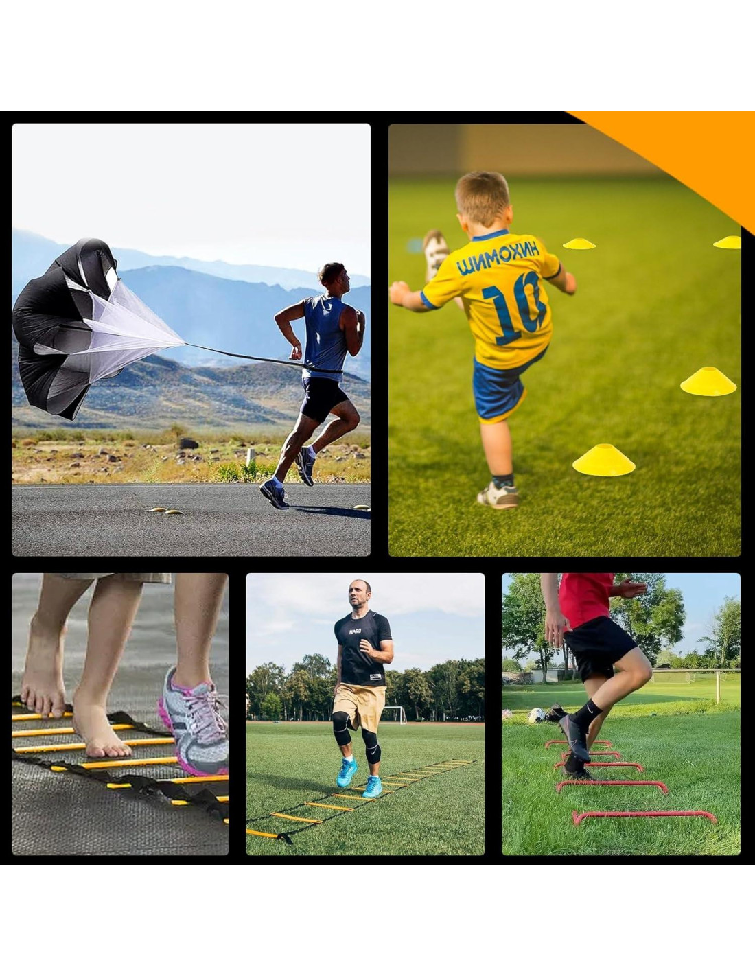 - [Conjunto de Equipos de Entrenamiento de Fútbol] Incluye 1 escalera de entrenamiento de velocidad amarilla (6.1 metros de largo, 12 peldaños) con 4 picos de acero, 12 conos discos, 4 obstáculos de agilidad, 1 paracaídas para correr, 1 cuerda para saltar, 1 bolsa de transporte. Puede satisfacer tus requisitos de entrenamiento para una vida más saludable.
