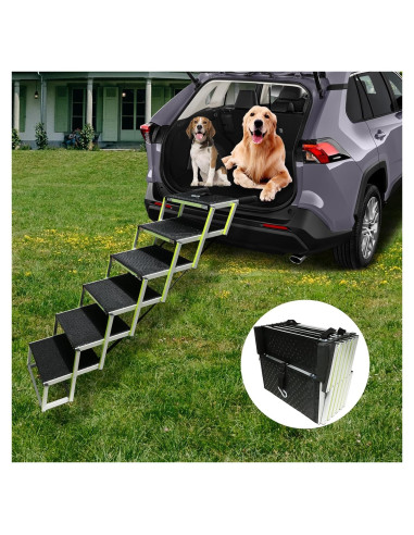 - Fácil de Almacenar y Transportar: La escalera para perros PENSUN está hecha de material de aluminio ligero, pesando solo 5.9 kilogramos, pero puede soportar un peso de 113.4 kilogramos. El diseño plegable facilita su almacenamiento y transporte. El tamaño plegado de la escalera para perros es solo 43 * 23 * 36 cm, lo que facilita su almacenamiento en cualquier rincón del vehículo o del hogar sin ocupar demasiado espacio.