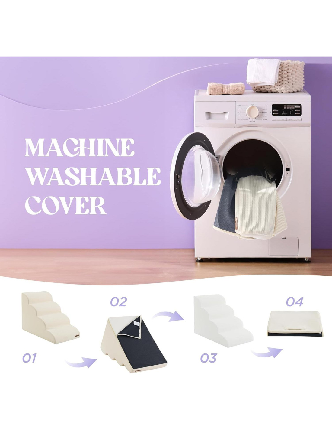 - Fácil de Limpiar: Mantener estas escaleras para perros frescas y ordenadas es muy sencillo. Simplemente retira el núcleo de espuma y lava a máquina la funda exterior por separado en agua fría en un ciclo delicado. Ten en cuenta que el núcleo de espuma no debe ser lavado o secado a máquina para asegurar un uso duradero y comodidad para tus mascotas.
