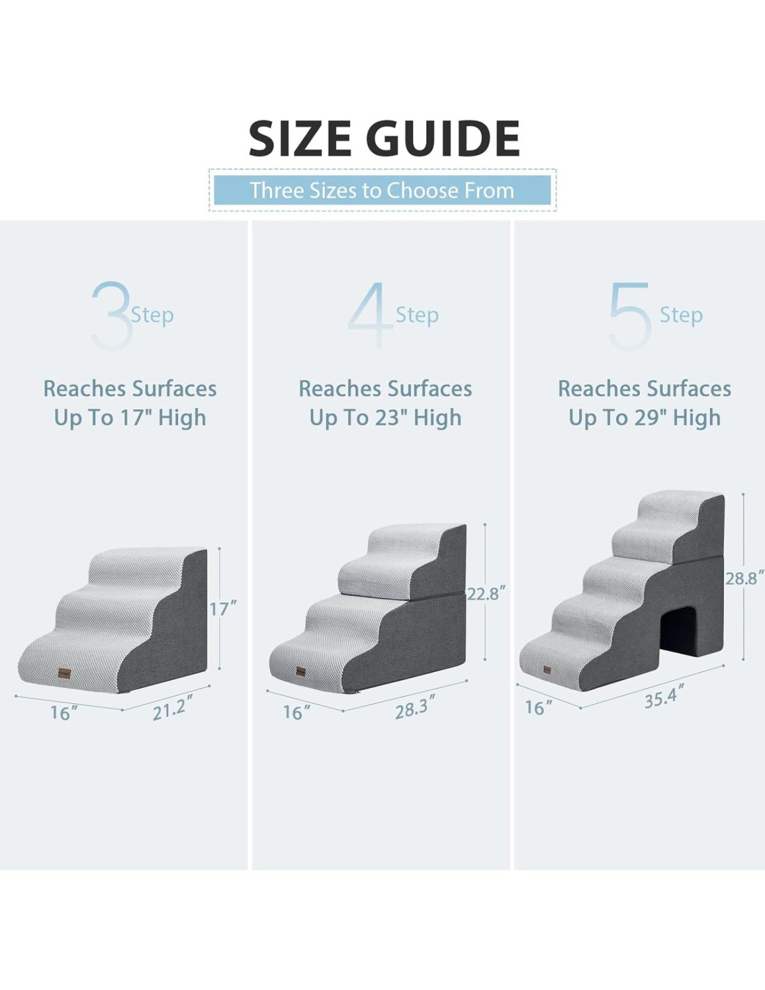 - MÚLTIPLES TAMAÑOS DE ESCALONES: Esta escalera para mascotas tiene 3, 4 y 5 escalones para elegir. Nuestras escaleras de 3 escalones se adaptan a sillas/sofás/camas de hasta 20 pulgadas (50.8 cm). Las escaleras de 4 escalones se adaptan a sillas/sofás/camas de hasta 24 pulgadas (61 cm). Y las escaleras de 5 escalones con un agujero para que las mascotas jueguen se adaptan a sillas/sofás/camas de hasta 28 pulgadas (71.1 cm).